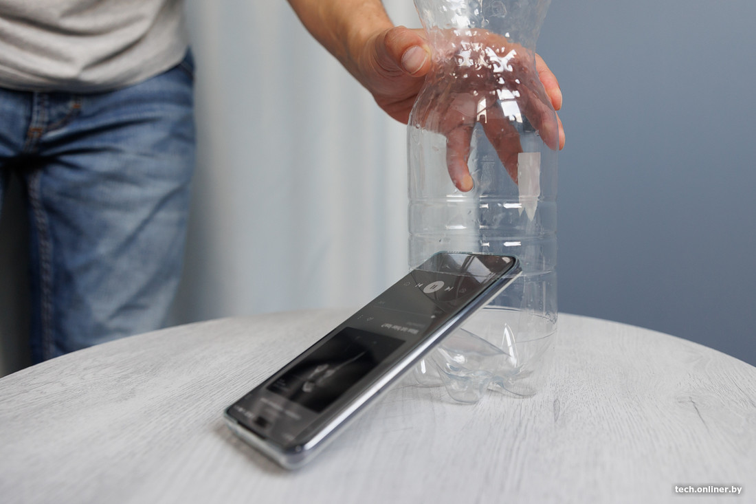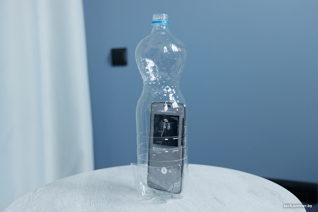 Второй вариант с бутылкой — поместить смартфон внутрь и получить экстаз. Нет, не вариант: все зазвучало в моно, звуки приглушены, середины нет.