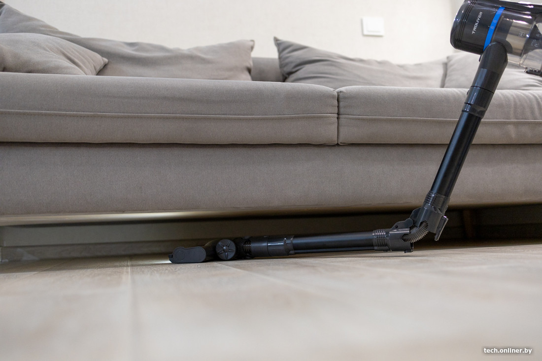 Гибкая труба позволяет заезжать под диван практически не нагибаясь. Но длины трубы при этом не хватает для того, чтобы достать до задней стенки. Поэтому такое решение — скорее вариант для заезда под менее габаритную мебель.