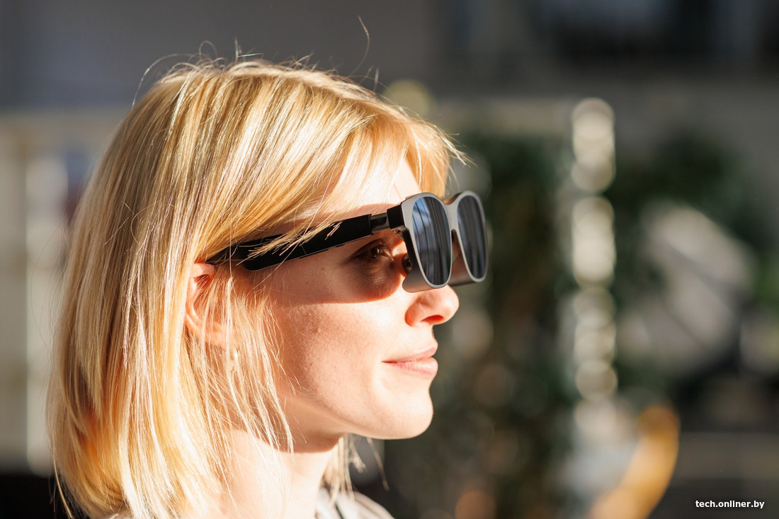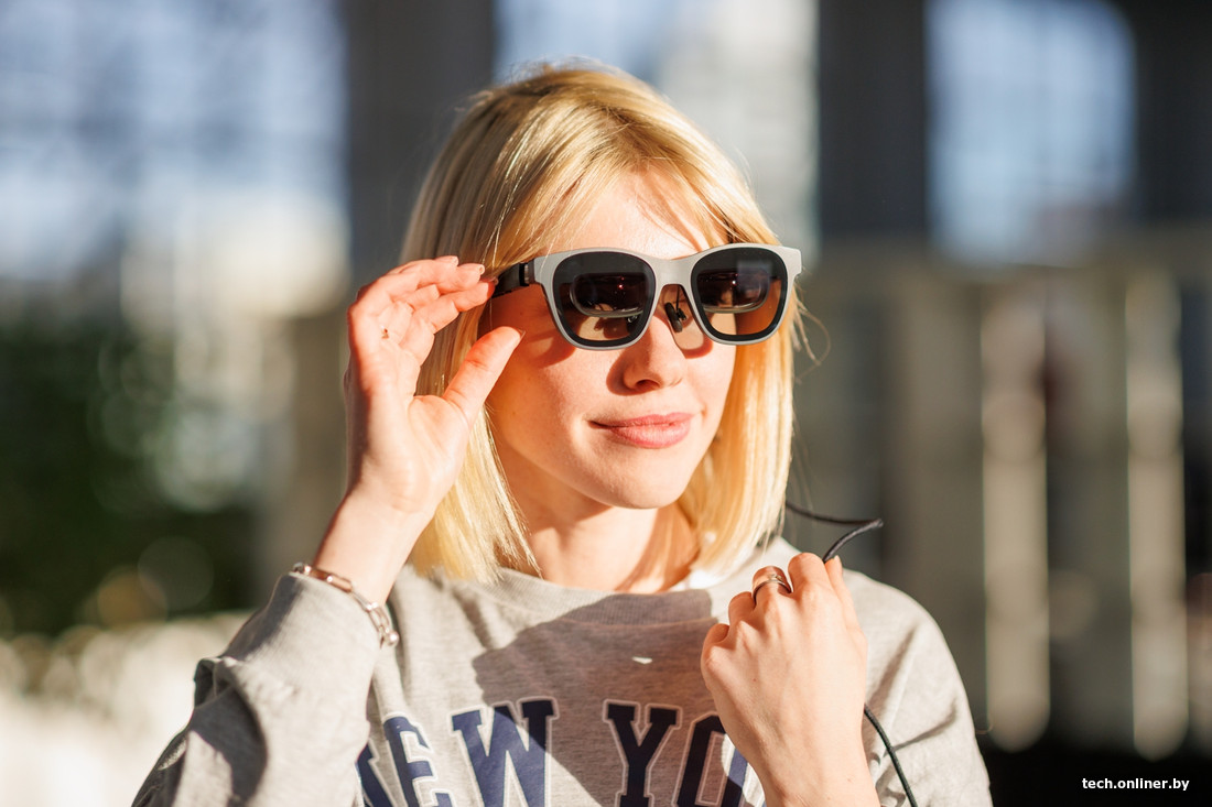 Дизайн в случае с такими устройствами вторичен: красоты хочется, однако основная цель очков — выводить качественную картинку. Очки удобно ложатся на переносицу в том числе за счет мягких носоупоров на гибких ножках, их вес не напрягает, хотя спустя часы работы/развлечений дискомфорт может появиться. Можно регулировать угол наклона дужек относительно линз, концы дужек также эластичные.