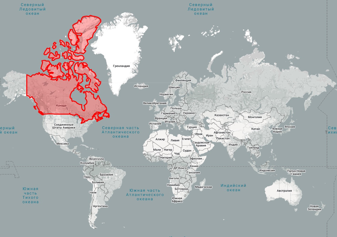 Провернем тот же трюк с еще одной большой северной страной. Канада — вторая в списке по площади территории среди всех государств. Без малого 10 миллионов квадратных километров. Взглянув на любую карту, запросто можно сделать вывод, что североамериканская страна протяженнее с севера на юг, чем Африка. Так ли это на самом деле? Думаем, вы уже догадываетесь.