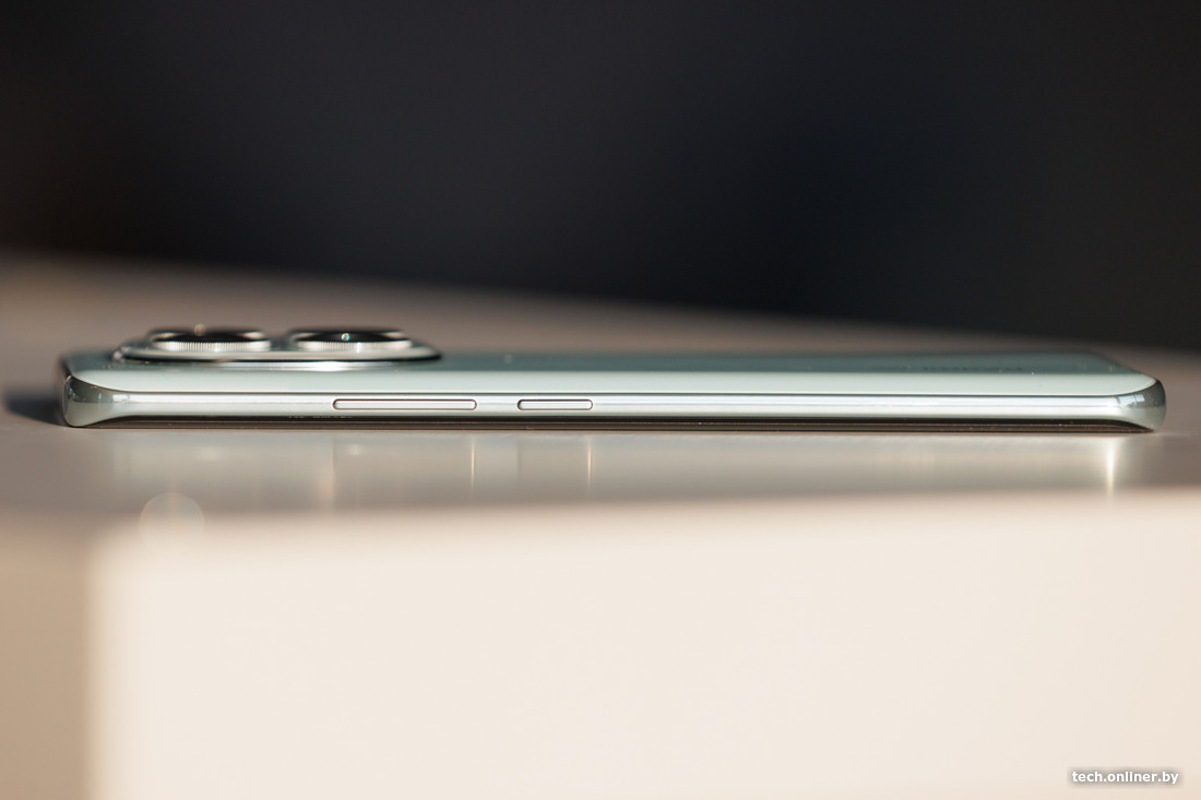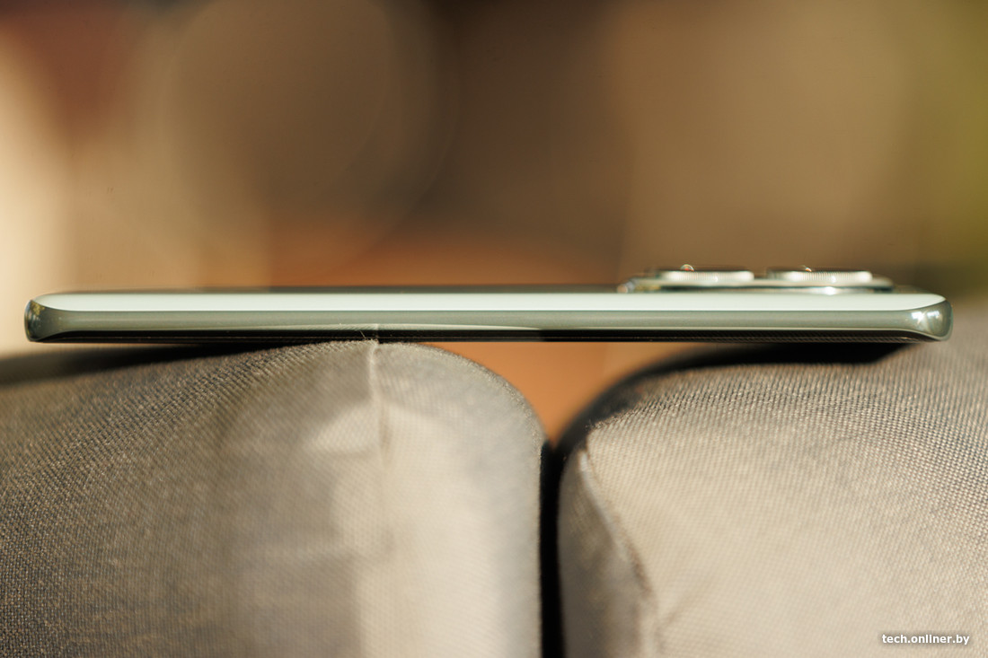 У нас на тесте телефон в зеленой расцветке с матовой, но гладкой «спинкой». И хотя на ощупь материал напоминает стекло, в корпусе используется пластик. Впрочем, на фронтальной части инженеры не экономили — экран защищает стекло Gorilla Glass Victus 2, поверх которого также нанесли тонкую пленку (с олеофобкой — приятно).