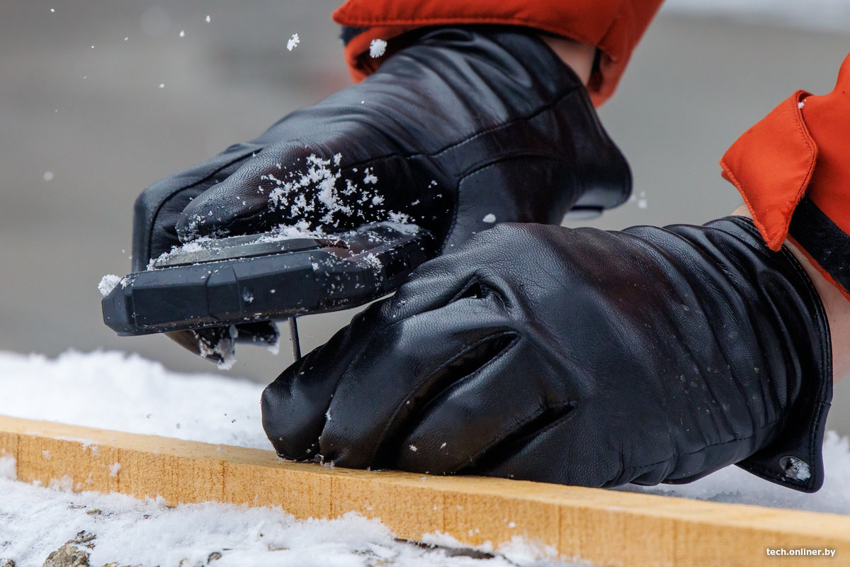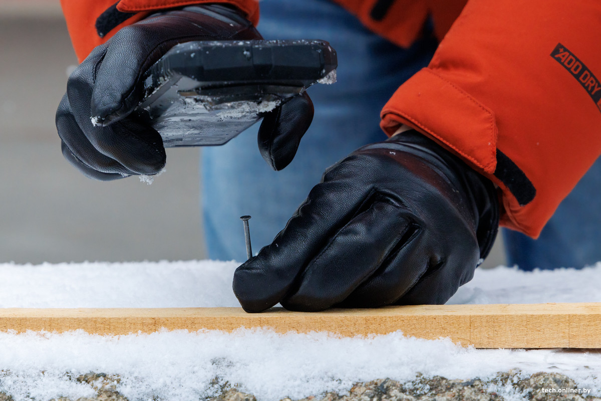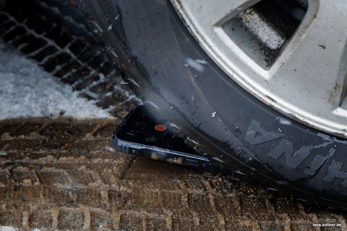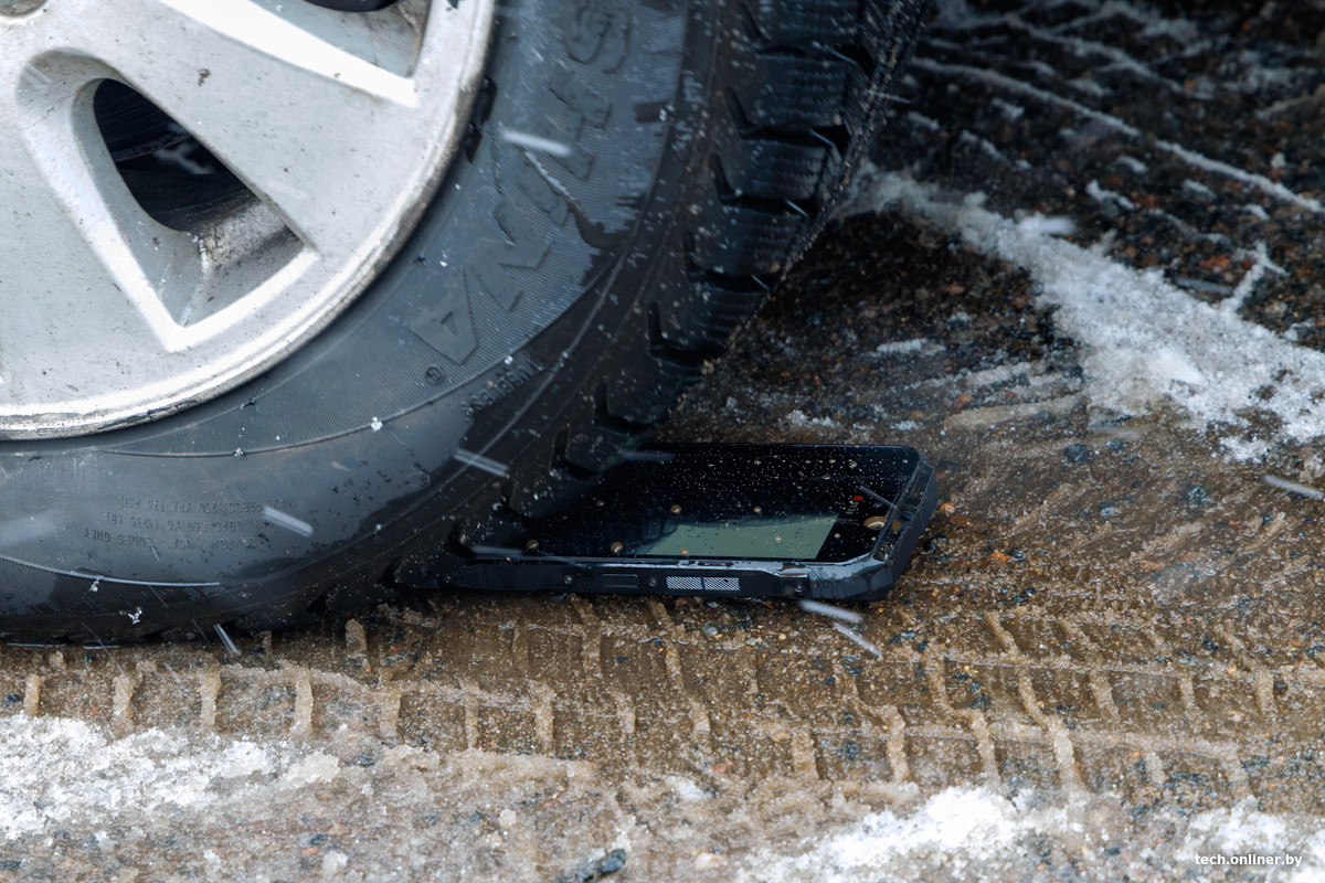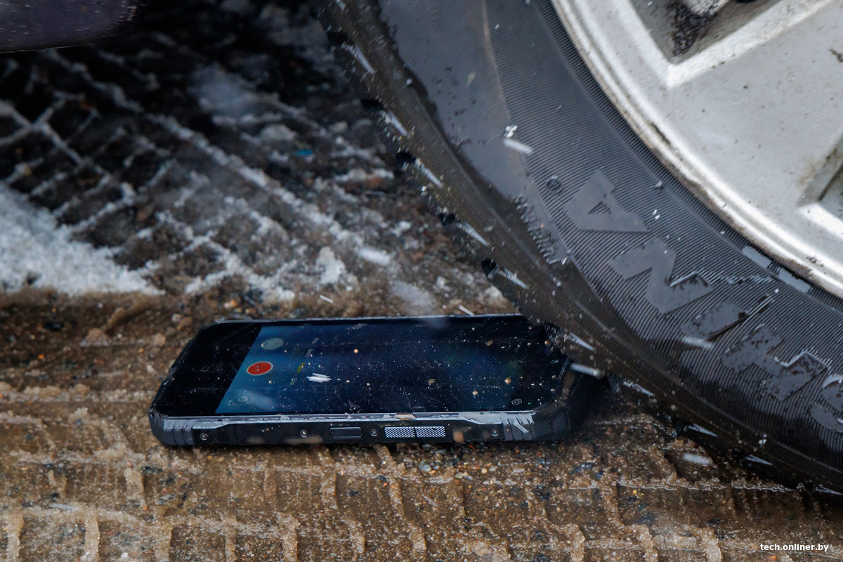 Первым испытанием для Doogee S Punk стала отправка его под протектор зимней резины. Здесь, правда, возникли опасения, связанные с конструкцией: защитная «клетка» для динамика вполне могла продавить корпус.