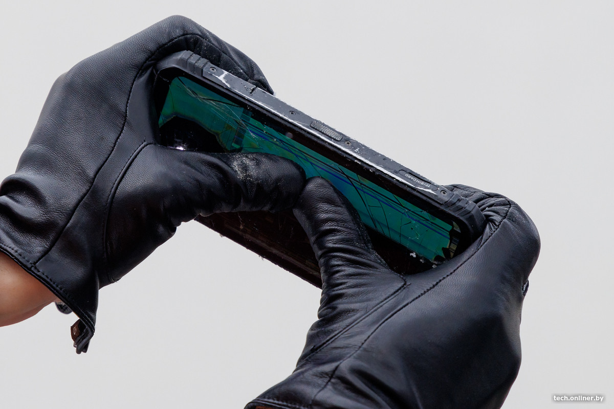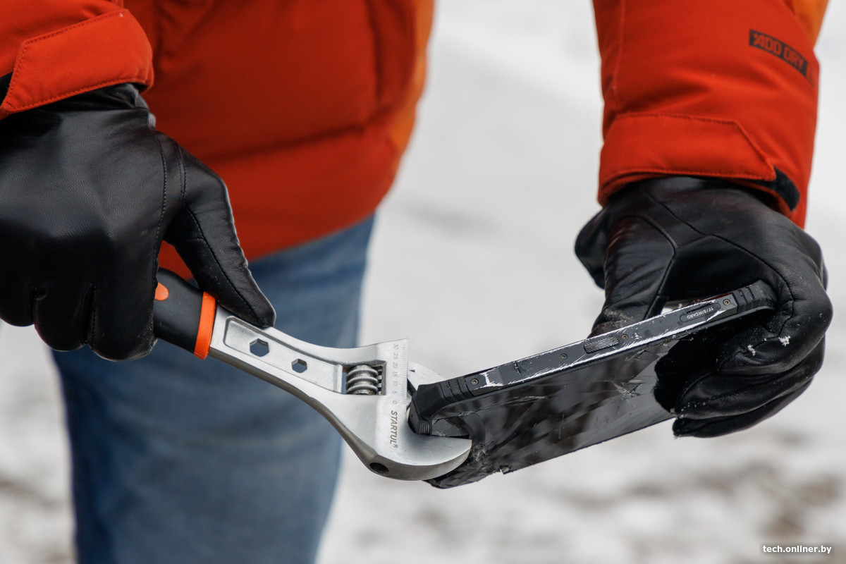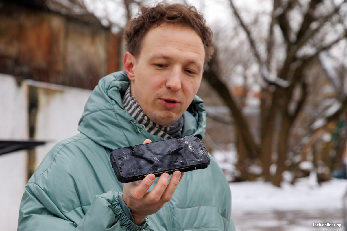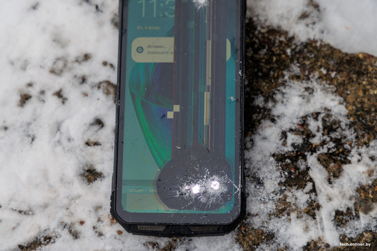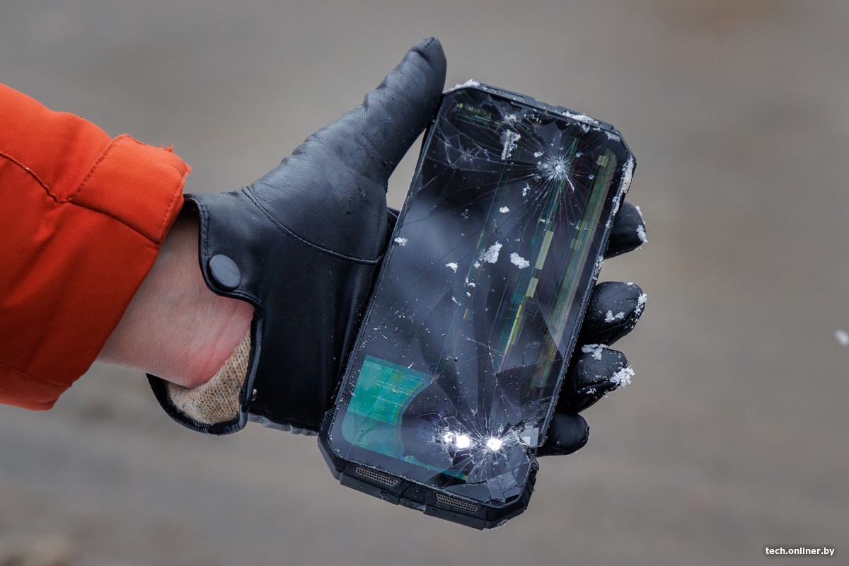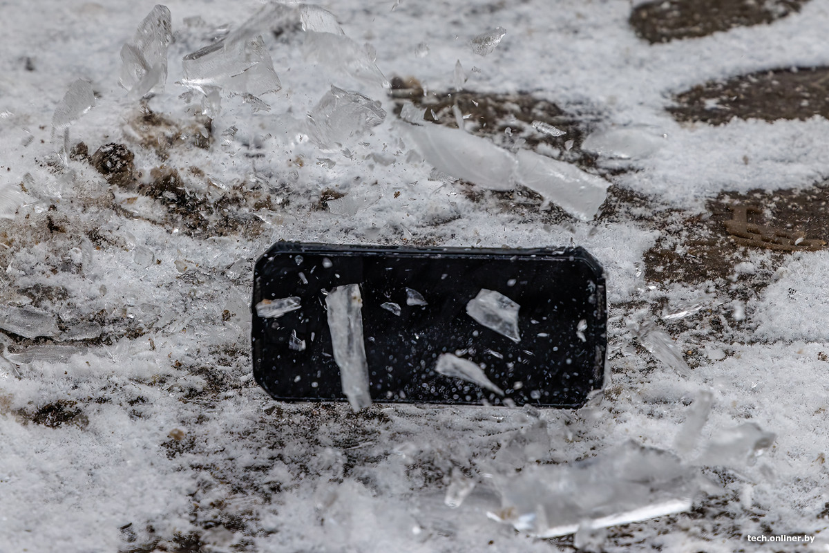 Но обошлось, хотя на третьем заезде, судя по всему, фронтальная камера все же вышла из строя. В остальном — ни царапинки, корпус и защитное стекло целые, смартфон включается, реагирует на прикосновения и вообще как новый. Пройдено.