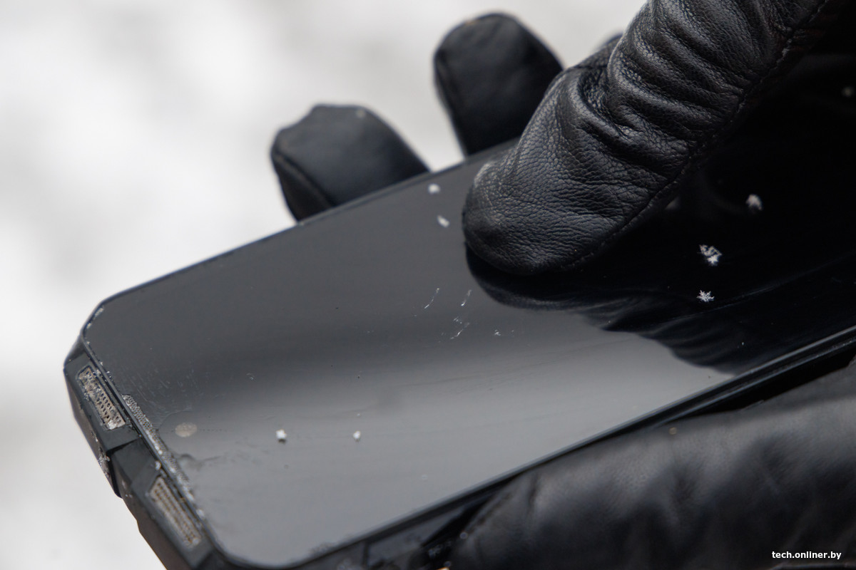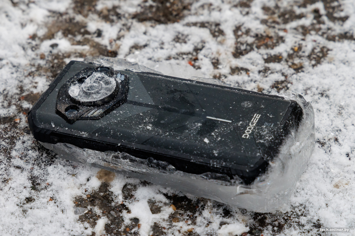 Первым показателем защищенности стало отсутствие пузырьков воздуха при погружении в воду: будь они, это означало бы попадание влаги туда, куда не надо. Замерзли аппараты Doogee удачно и красиво. Пройдено.