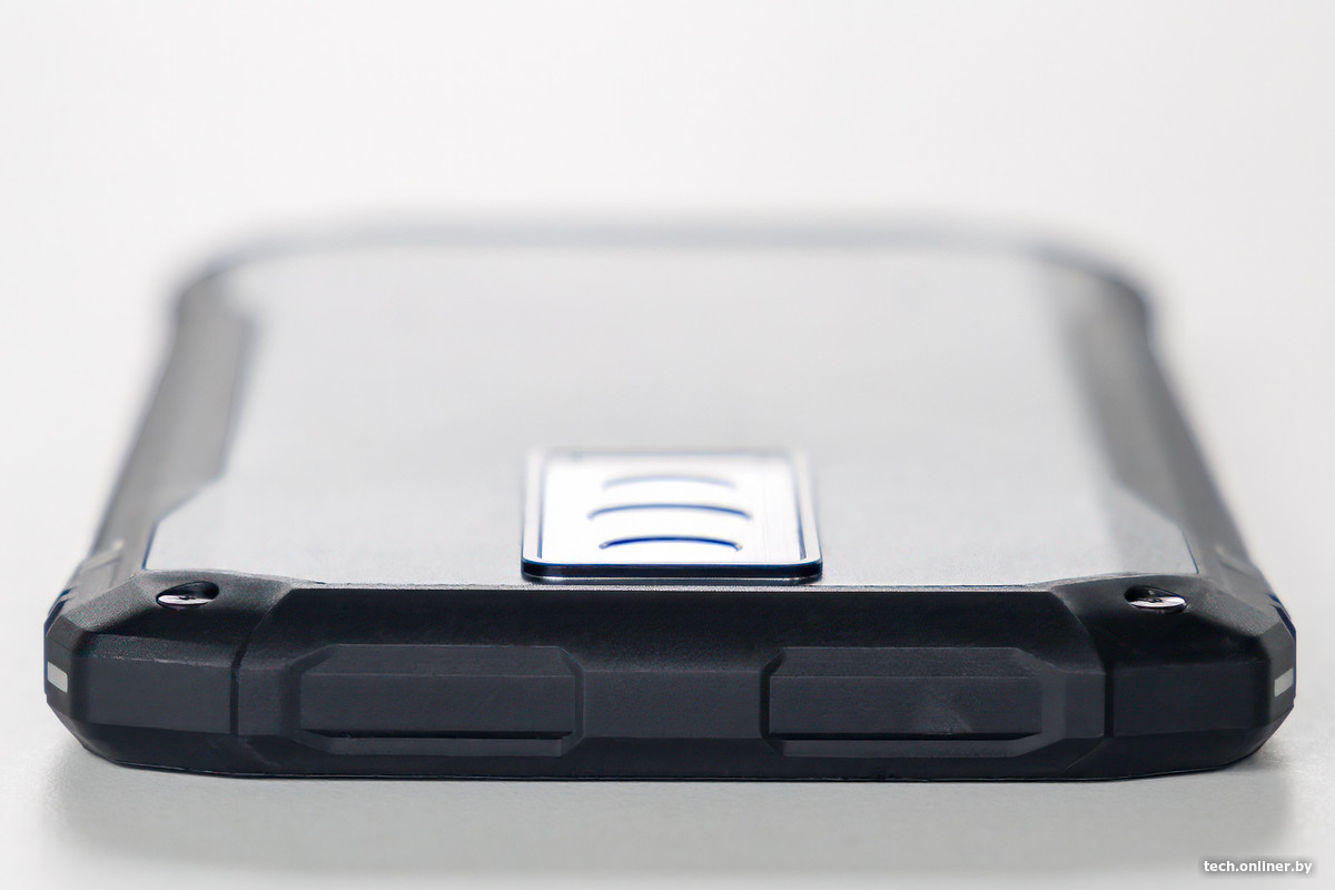 Корпус даже внешне кричит о защищенности: металлическая рамка по периметру с резиновыми вставками на уголках и сверху. Задняя панель выполнена из плотного прочного пластика. Центральным элементом дизайна является металлическая мандала на месте, где обычно размещена фотокамера. Напоминает то ли лик Трансформера, то ли вентилятор охлаждения атомной энергоустановки.