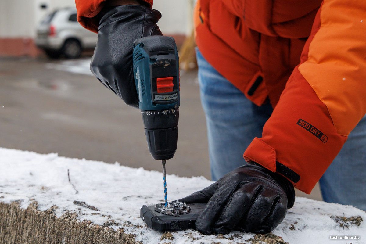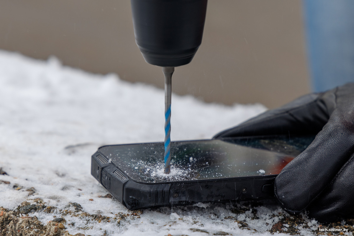Примерно на этом этапе была совершена ошибка: мы решили посверлить экран Doogee S Punk низкооборотистой дрелью, а не оставить это испытания на финал. К сожалению, получилось. Сенсорный слой стал работать через раз, но ввести пароль и слегка взаимодействовать с интерфейсом все еще было можно. Также можно сделать другие выводы: экран стойкий и всякие ключи в кармане ему точно нипочем, дрель в ударном режиме может просверлить стекло, в обычном — только царапает и делает небольшие углубления. Не пройдено.