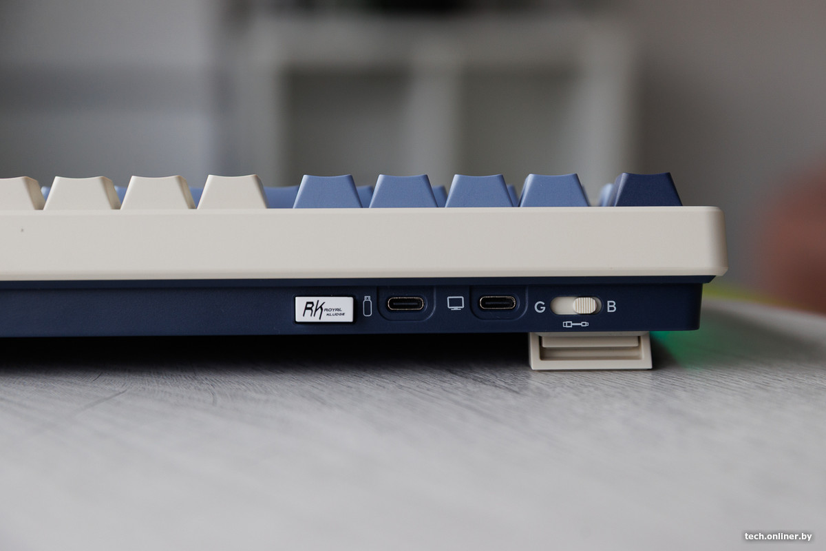 Клавиши высокие, регулируемая подсветка не сквозная, так что нужен внешний источник света. Ход кнопок мягкий, однако Royal Kludge S85 с линейными светло-голубыми переключателями достаточно шумная, что особенно заметно при быстром наборе текста.