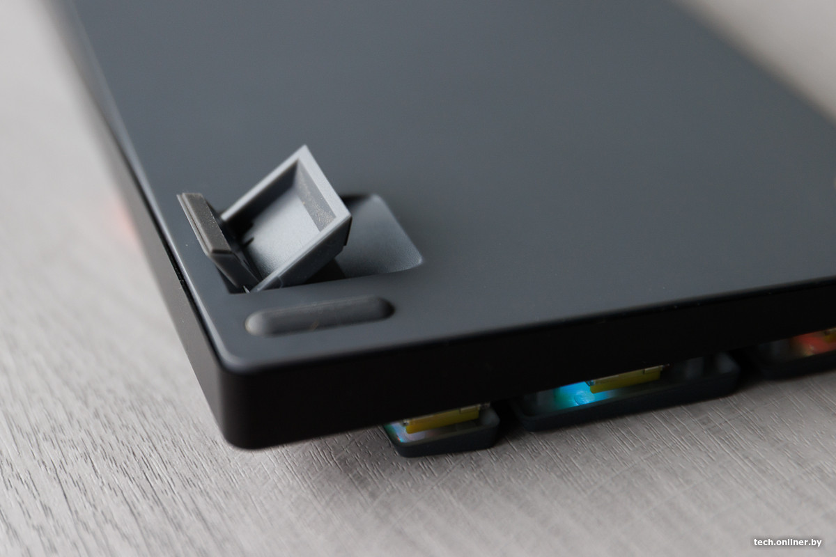 Клавиатура высокая, поэтому для длительной работы может потребоваться подставка под запястья, если они вам дороги. Нужно привыкнуть и к колпачкам, которые сужаются кверху, хотя это обычная для игровой механики с высокими кейкапами эргономика.