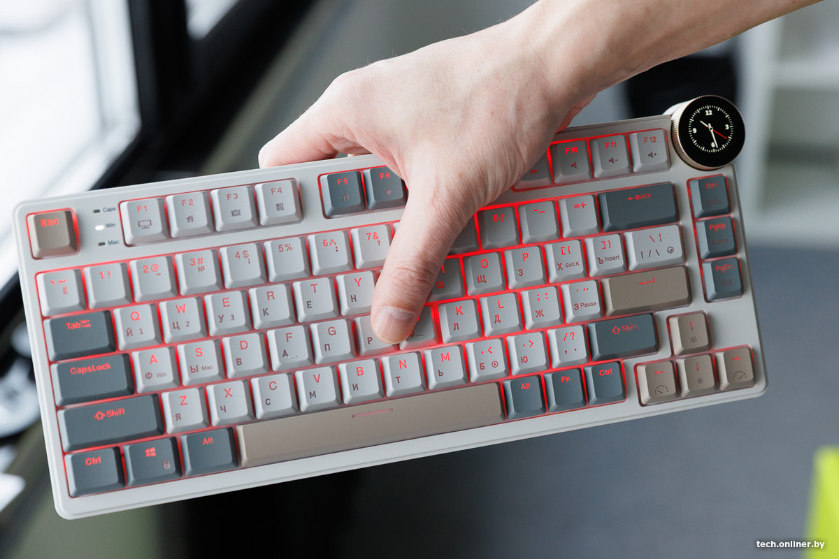 Компактная (75%) механическая беспроводная клавиатура с подсветкой. Подключение через USB, радио и Bluetooth. Переключатели в нашем случае — красные. Клавиатура увесистая для своих габаритов, подсветка лучше на латинице, кириллица подсвечена так себе. Есть также «шайба» для управления функциями и интегрированный в нее дисплей для вывода информации.