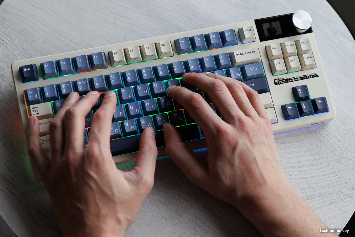 «Royal Kludge? — первый вопрос. — Очень классная вот эта штука (нащупывает шайбу-регулятор), клик приятный. C „крутелкой“ — хорошая реализация, но лучше бы ее поставить слева, чтобы руку от мыши не отрывать во время игры или работы. Экранчик — очень прикольная фишка: не надо гадать, что ты сделал.