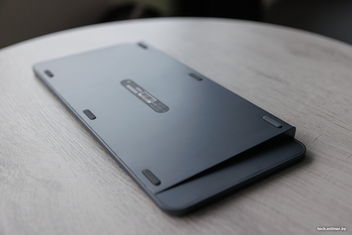 Клавиатура получила двухпозиционные резиновые ножки, она не скользит на столе. Подключается по USB, радио и Bluetooth.