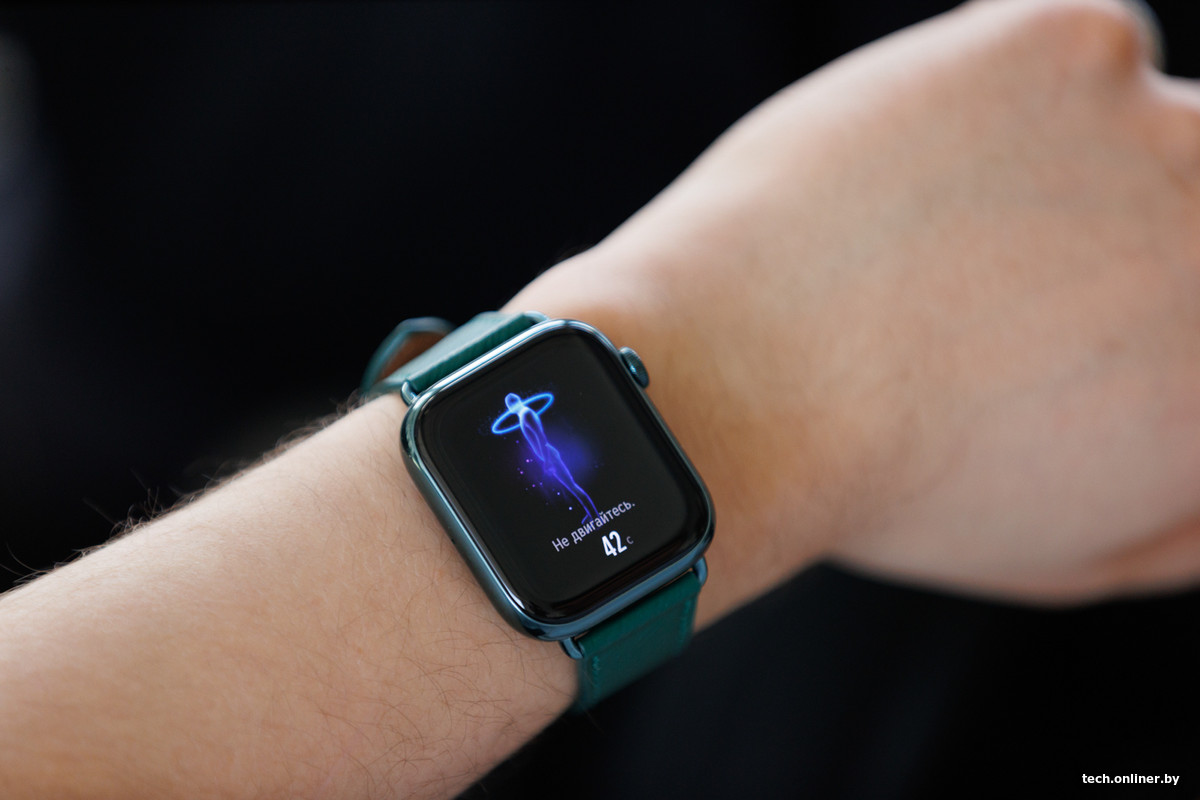 Основа корпуса выполнена из металла, подложка — из пластика. Длина прямоугольного корпуса — 45,6 миллиметра, ширина — 39,4, толщина — 11. Без ремешка девайс весит 35 грамм. На руке смарт-часы сидят удобно, и лично я проводил с ними все время — и днем, и ночью. При этом со мной они прошли через тренировки, посещения душа (здесь обозначен класс влагозащиты в 5 АТМ), многократные уборки квартиры и возюканье на детской площадке — и не словили ни одной царапины. И корпус, и экран гаджета после недели носки выглядят так, будто их только-только вынули из коробки.