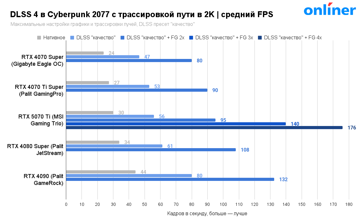 С выходом DLSS 4 сравнение производительности игр с включенным апскейлингом становится менее корректным. Поддержка DLSS 4 постепенно добавляется разработчиками, и на данный момент не все тестируемые игры адаптированы под новую технологию. Поэтому сравнение результатов с разными версиями DLSS может быть нерелевантным.