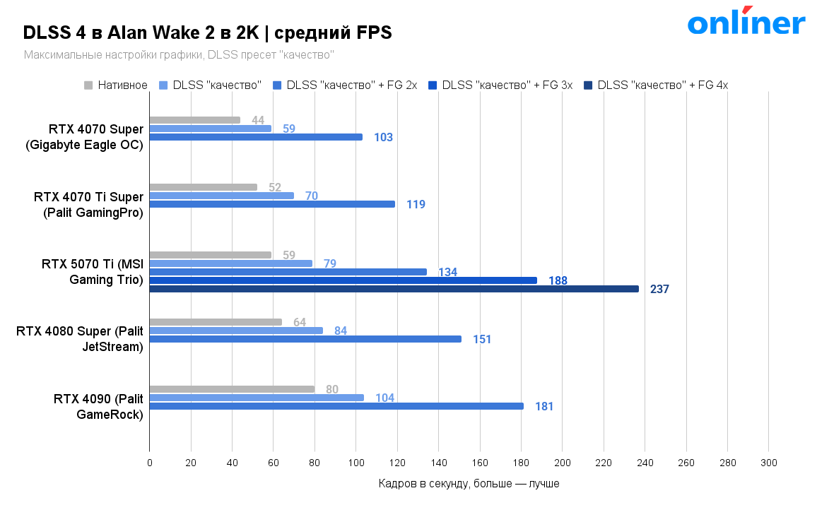 В целевом 2К-разрешении RTX 5070 Ti выдает 99 fps, что на 11% быстрее RTX 4070 Ti Super и на 26% быстрее RTX 4070 Super.
