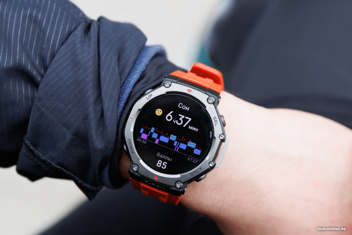 Дизайн смарт-часов может показаться грубоватым, и это диссонирует с тем, насколько удобными ощущаются T-Rex 3. Ты быстро привыкаешь к их весу и размеру, а запястье под ними не потеет из-за количества отверстий в ремешке. Лично я не снимал часы даже ночью, так что в плане комфорта тут все в порядке.