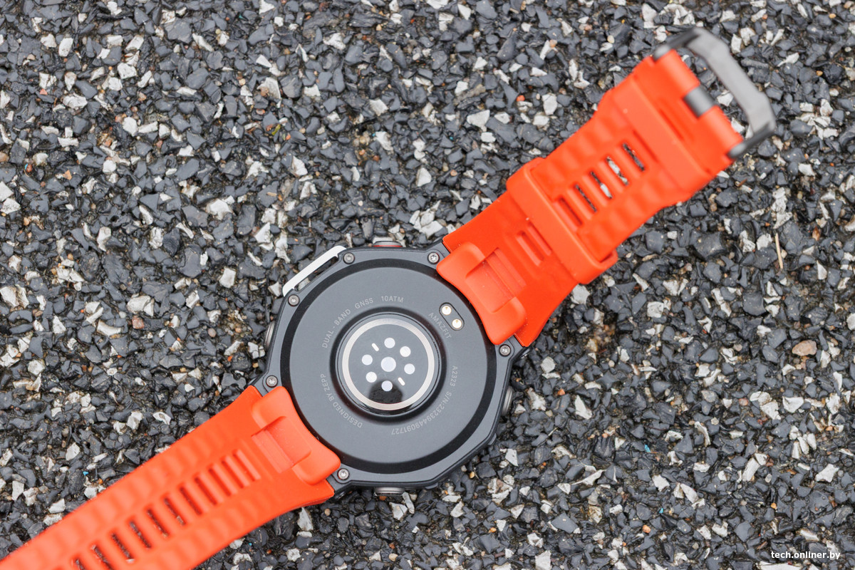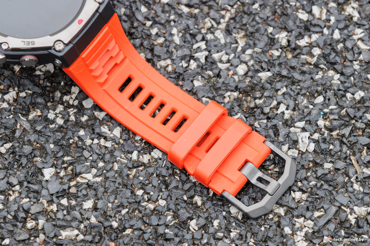 Представлены T-Rex 3 в трех цветах: белом, черном и оранжевом. Нам достался последний вариант, который официально называется «Лава». Примечателен он не только нескучным цветом, но и текстурным рисунком ремешка. Чтобы его снять, вам понадобится специальная миниатюрная отвертка, которая идет в комплекте с часами. К ней же прилагаются две пластиковые заглушки: после их установки к корпусу можно будет присоединить любой ремешок шириной 22 мм.