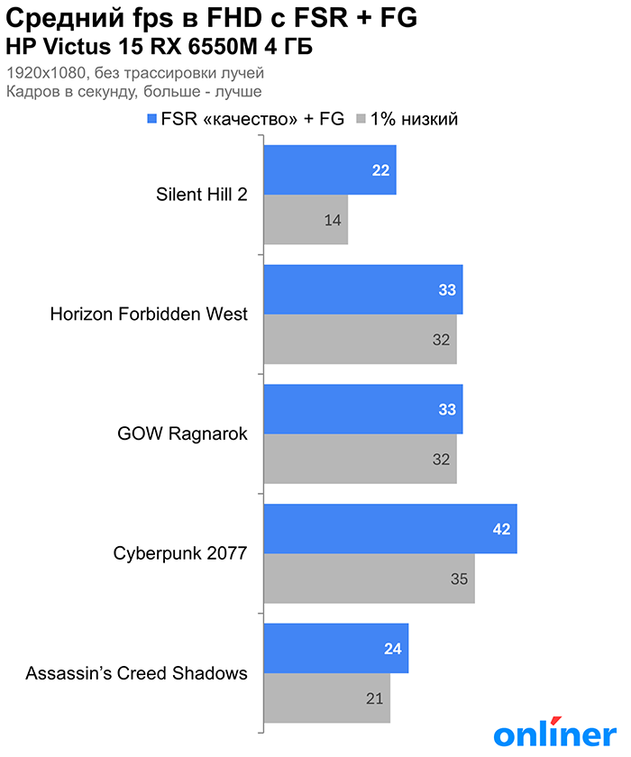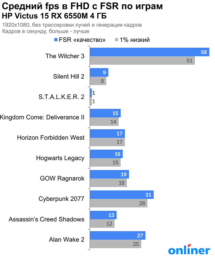 С HP Victus совсем грустно — он вовсе не показал прироста fps с включением FSR. Вероятно, это связано также с нехваткой вычислительных мощностей видеочипа для работы технологии масштабирования.