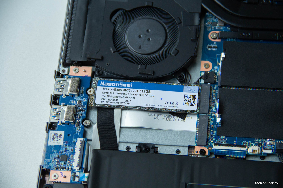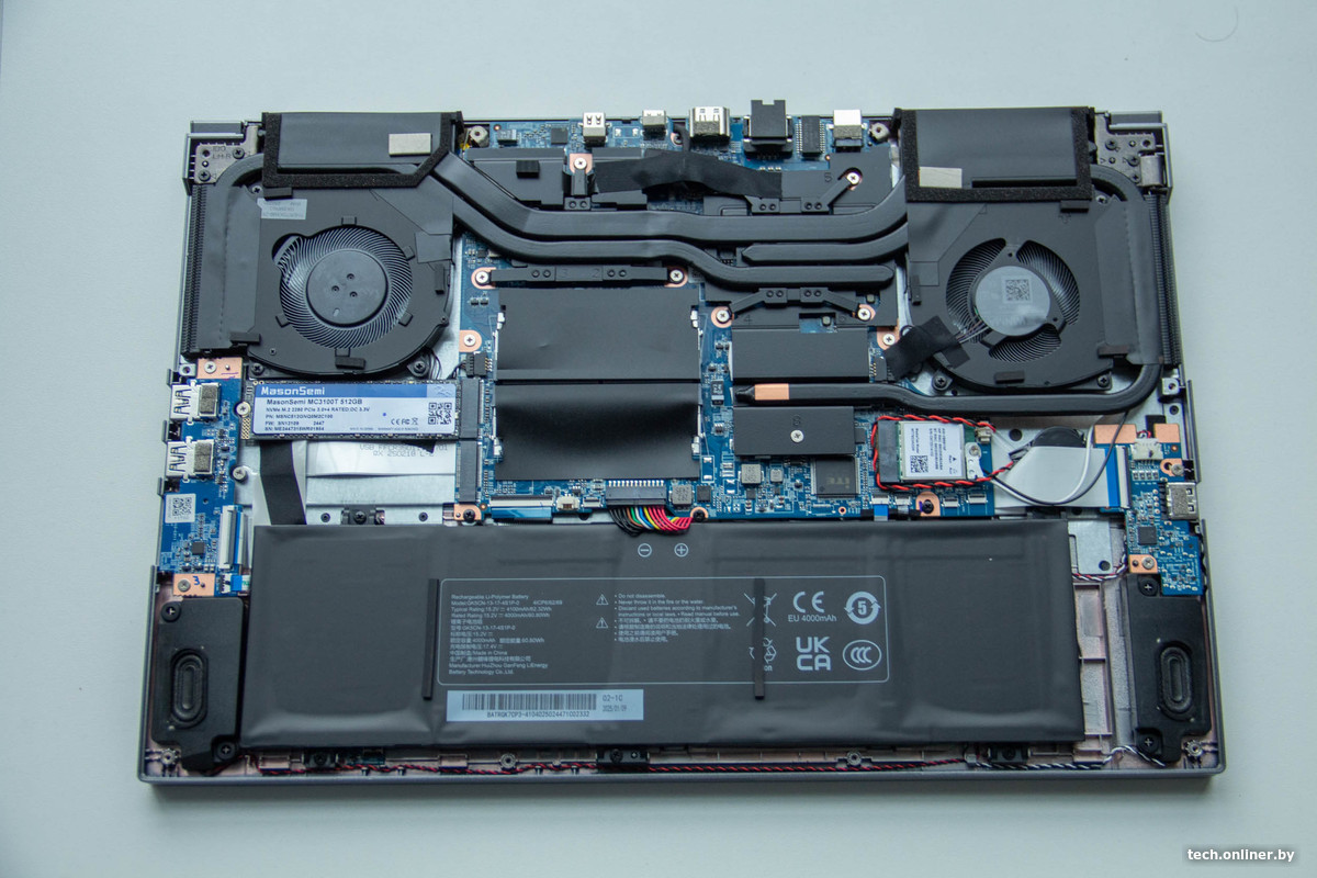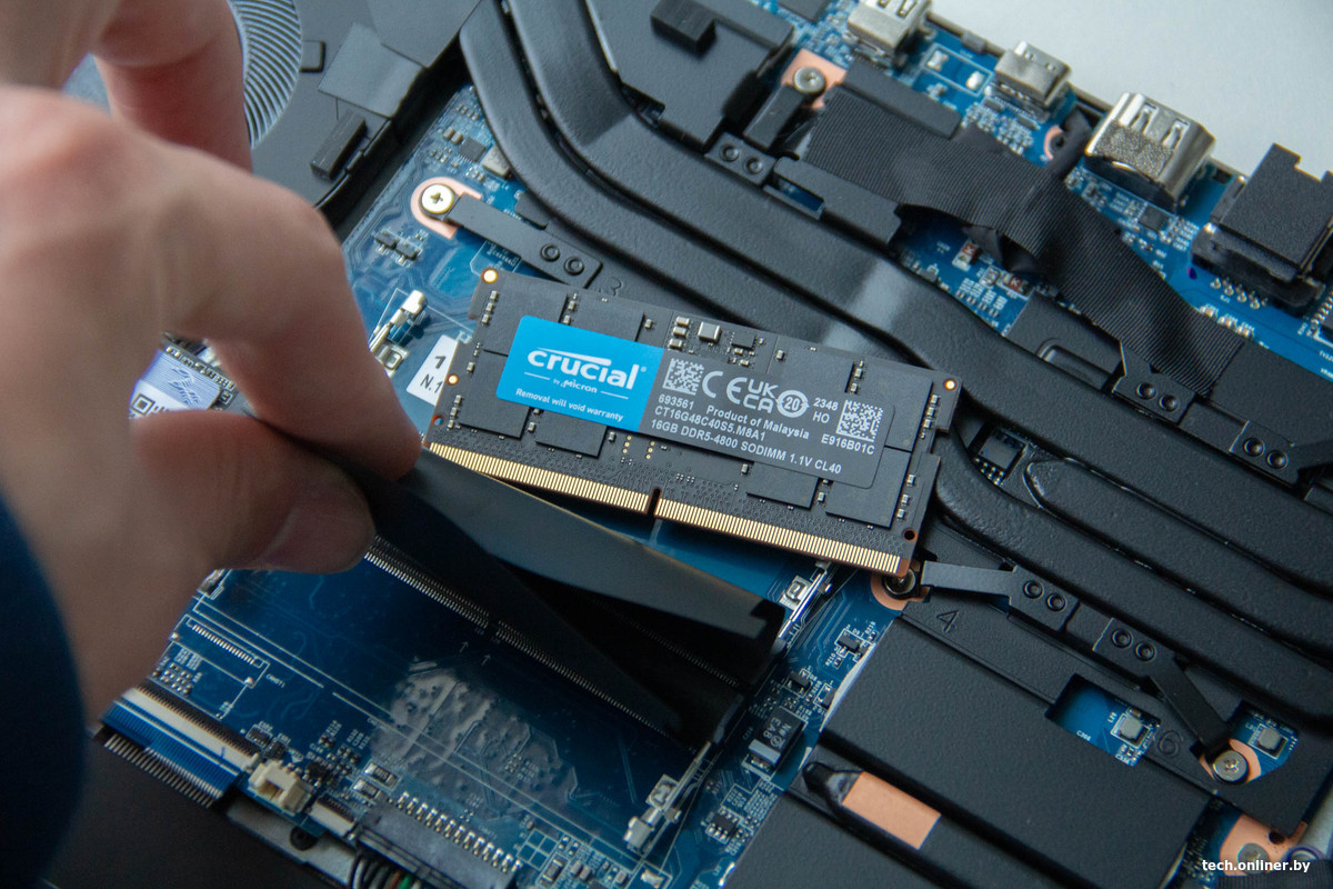 У Mechrevo тепло отводится по трем тепловым трубкам и рассеивается двумя вентиляторами. Есть термопрокладка для накопителей - всего их можно установить два. Важная деталь: в ноутбук установлена ОЗУ всего одной планкой DDR5 от Crucial на 16 ГБ, по этой причине она работает в одноканальном режиме. Это облегчает апгрейд в дальнейшем, однако плохо сказывается на производительности «из коробки».