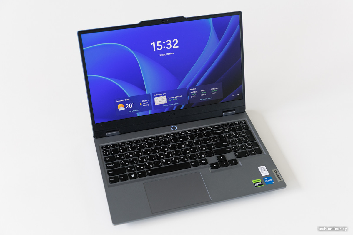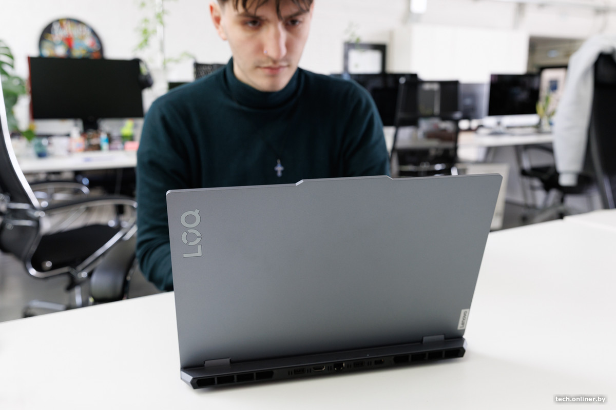 Lenovo LOQ 15IAX9 порадовал экраном, который открывается на 180 градусов. Само по себе устройство приятное, однако заметно проще линейки Legion: корпус пластиковый, тачпад «щелкает», в целом в руках ноутбук ощущается не так круто, как «старший брат». На кнопке включения ноутбука есть индикация с помощью трех цветов: таким образом, всегда визуально можно отследить, в каком профиле работы используется ноутбук. Модуль камеры слегка выступает, однако это идет ноутбуку на пользу — его банально проще открыть.