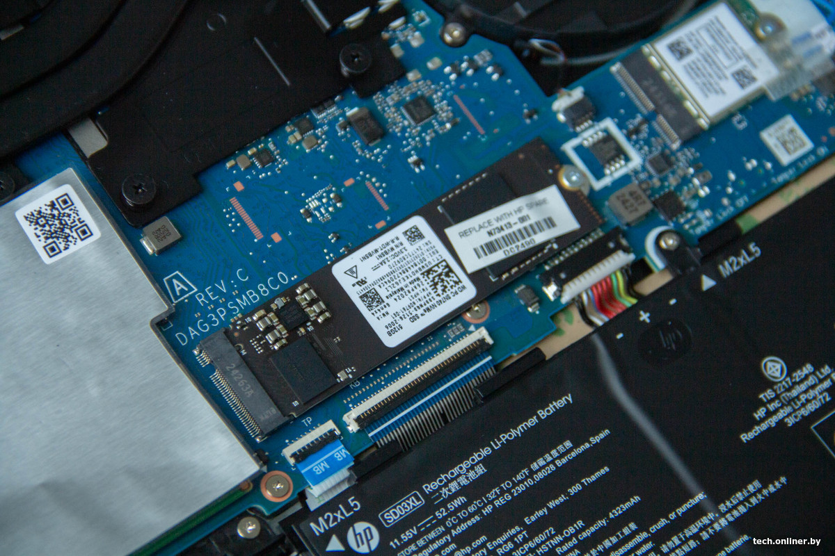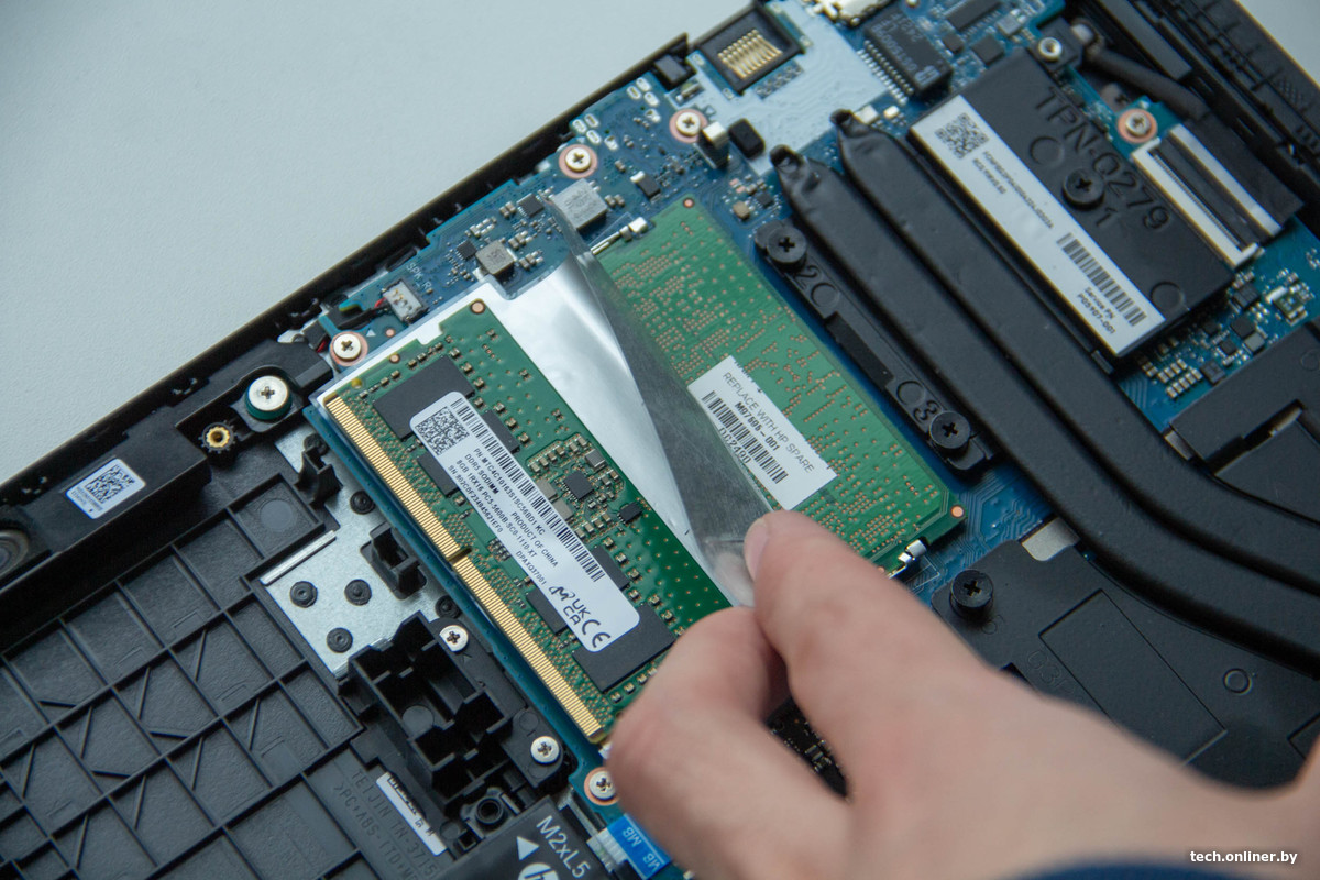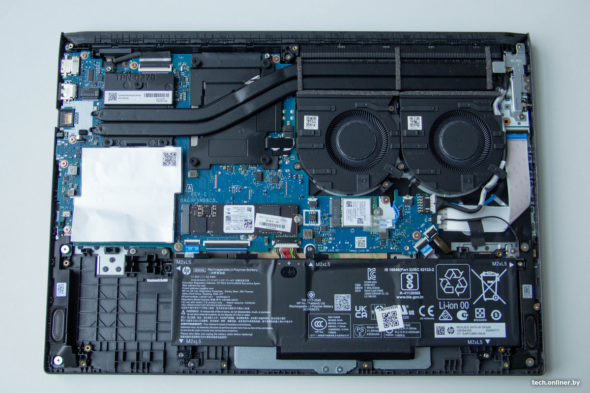 Система охлаждения у HP Victus оказалась необычной: оба вентилятора и радиатора размещены в одной зоне, а тепло от ЦП и ГП отводят всего две теплотрубки. Присутствуют термопрокладки для SSD и оперативной памяти. Сама ОЗУ организована двумя планками DDR5 от Micron. SSD установлен от компании WD, места под дополнительный накопитель, к сожалению, нет.