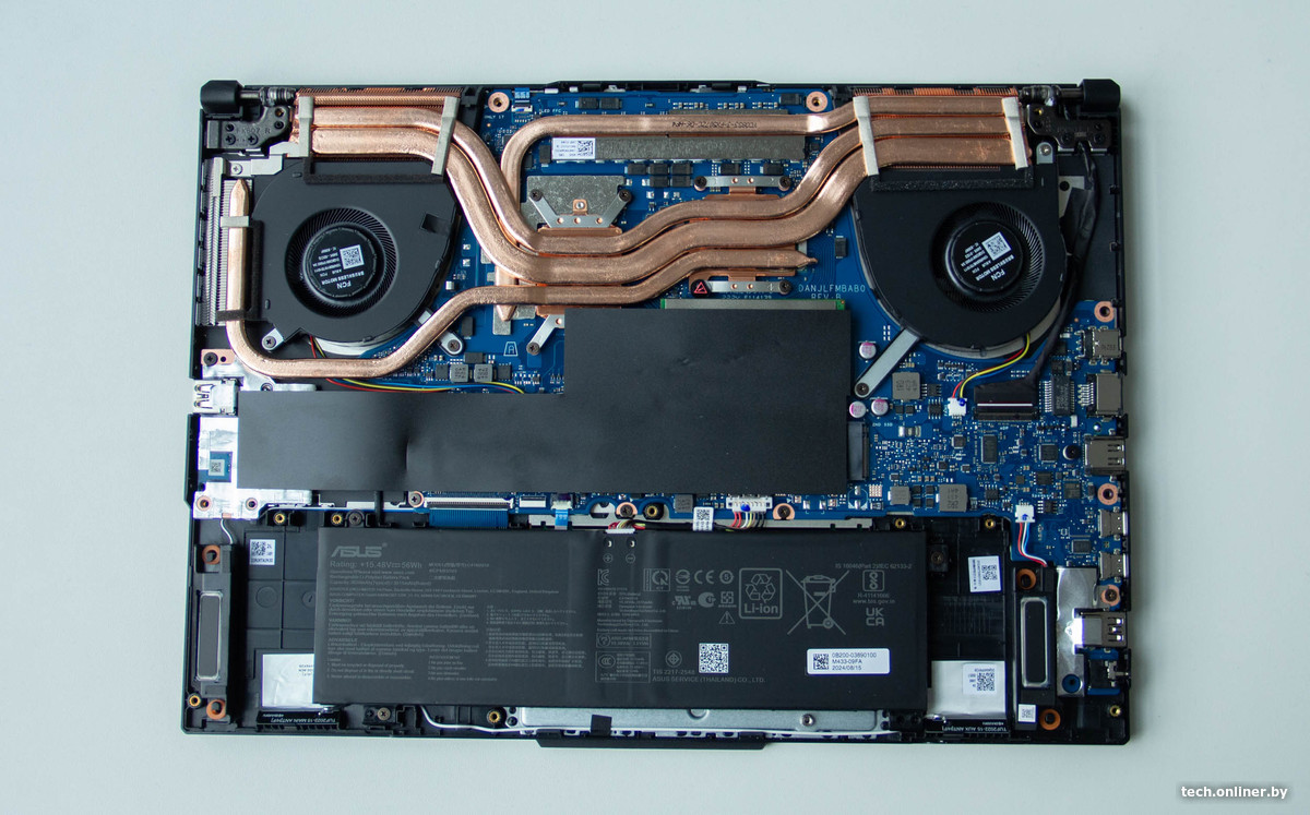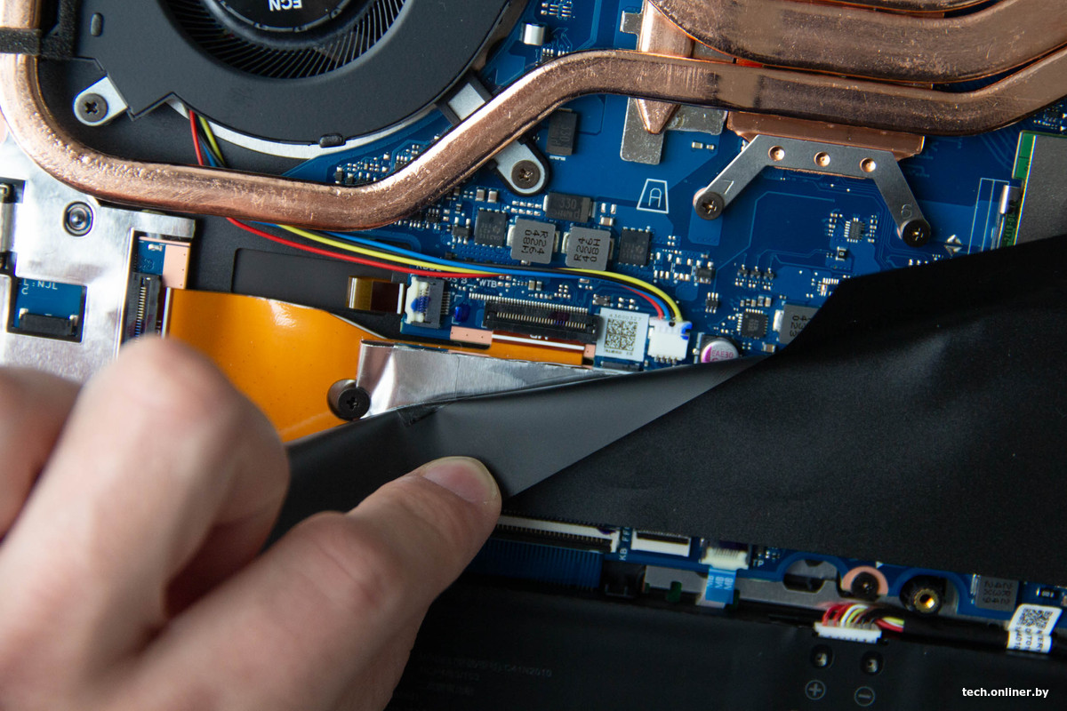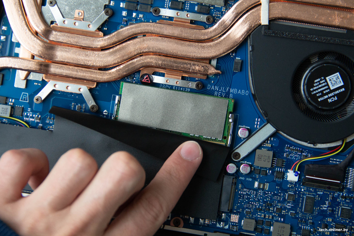 В ASUS TUF Gaming от центрального и графического чипов тепло отводится по медным трубкам, две из которых соединены между собой и еще две уводят тепло каждая в свой радиатор. Приятно было увидеть теплорассеивающие пластины на оперативной памяти и SSD. Оперативная память установлена двумя планками DDR4 по 8 ГБ. Порадовало место для дополнительного M.2 2280 NVMe-накопителя.