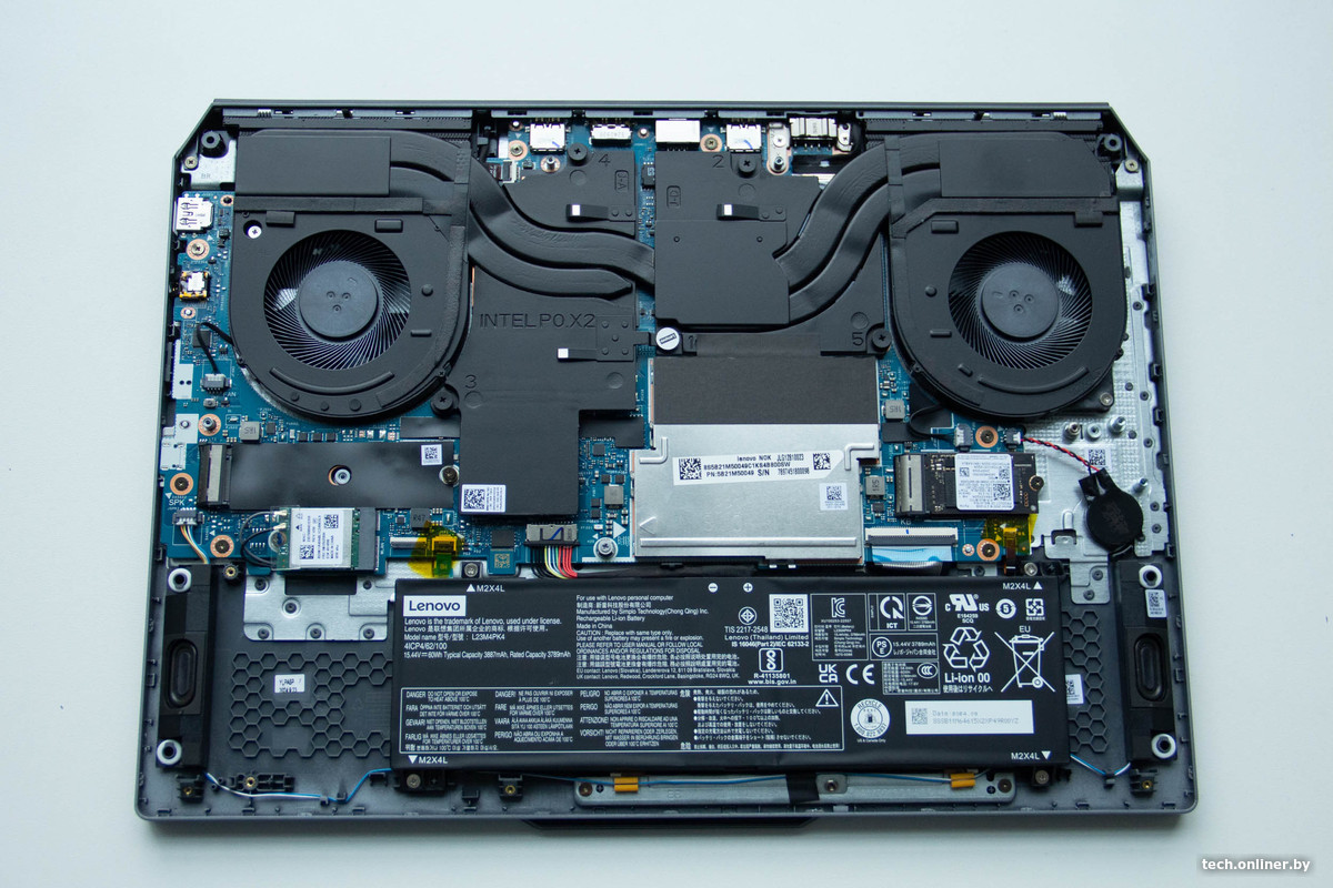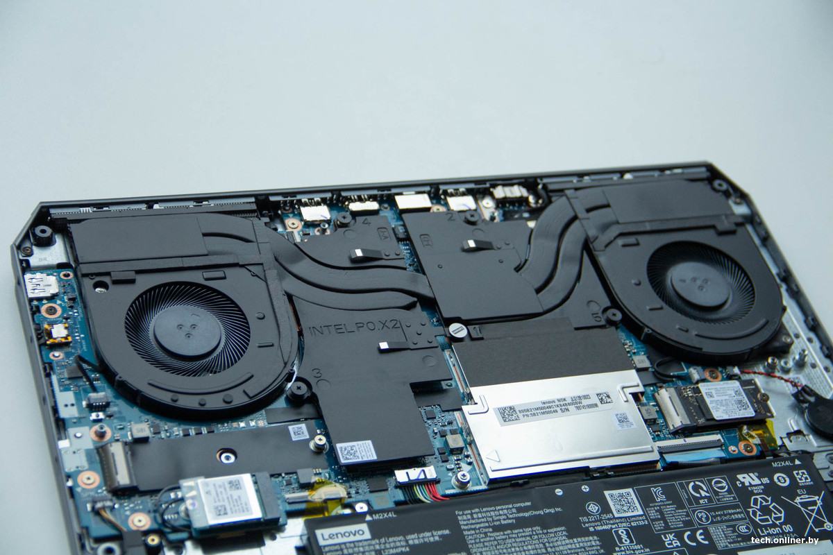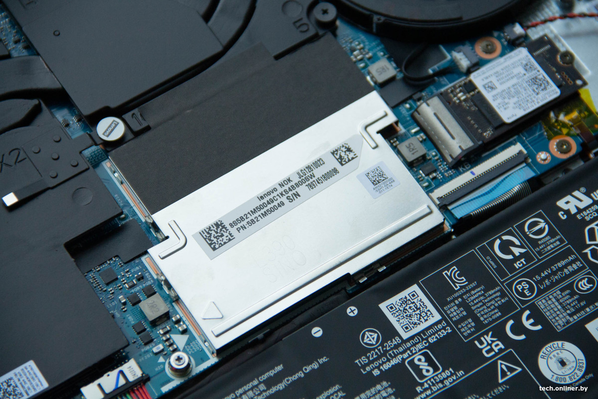 В Lenovo LOQ система охлаждения устроена всего двумя теплотрубками и двумя вентиляторами. Модель имеет дополнительный слот под M.2 NVMe-накопители. Оба слота расположены в противоположных местах платы. Термопрокладка есть не только для основного накопителя, но и для дополнительного пустого слота. Оперативная память DDR5 от Samsung установлена двумя планками по 8 ГБ и спрятана под металлический бампер для изоляции от остальных тепловых источников ноутбука.