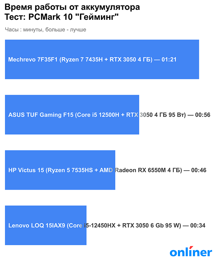 В играх Mechrevo стал лидером по части автономности со временем работы в 1 час 21 минута. Самое непродолжительное время работы от батареи в играх оказалось у Lenovo LOQ — всего 34 минуты.