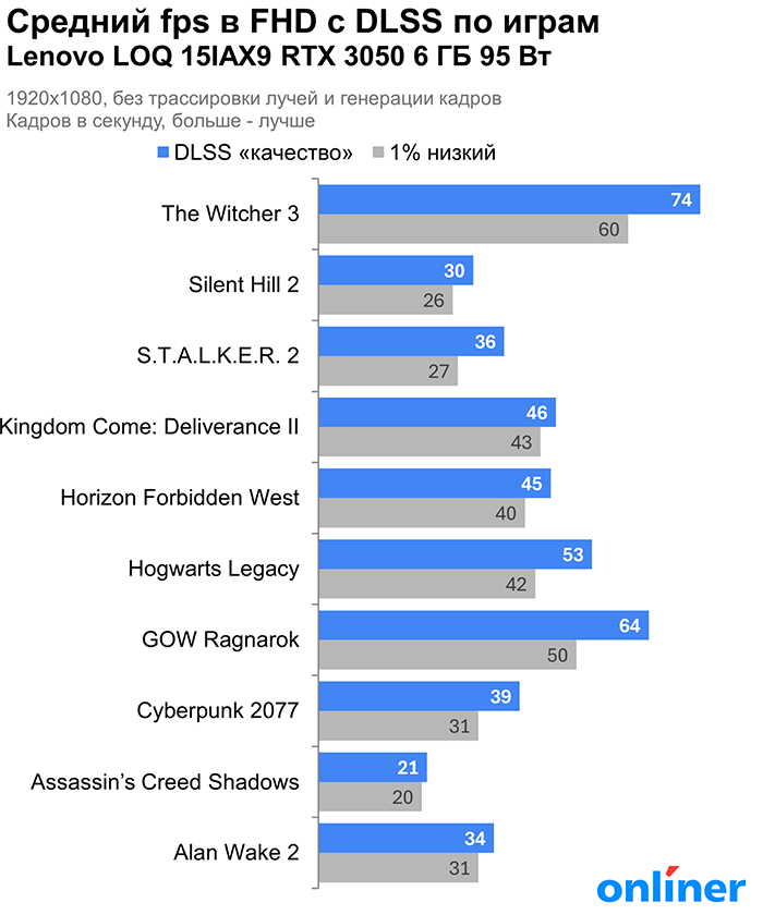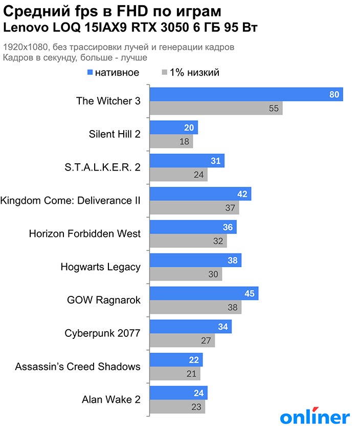 Самым производительным оказался Lenovo LOQ с 37 fps в среднем без DLSS и трассировки лучей. Лидером он стал благодаря более мощной версии видеокарты RTX 3050 и 6 ГБ видеопамяти. Он стоит дороже HP и Mechrevo на 100—200 руб., но эта разница оправдана приростом производительности.