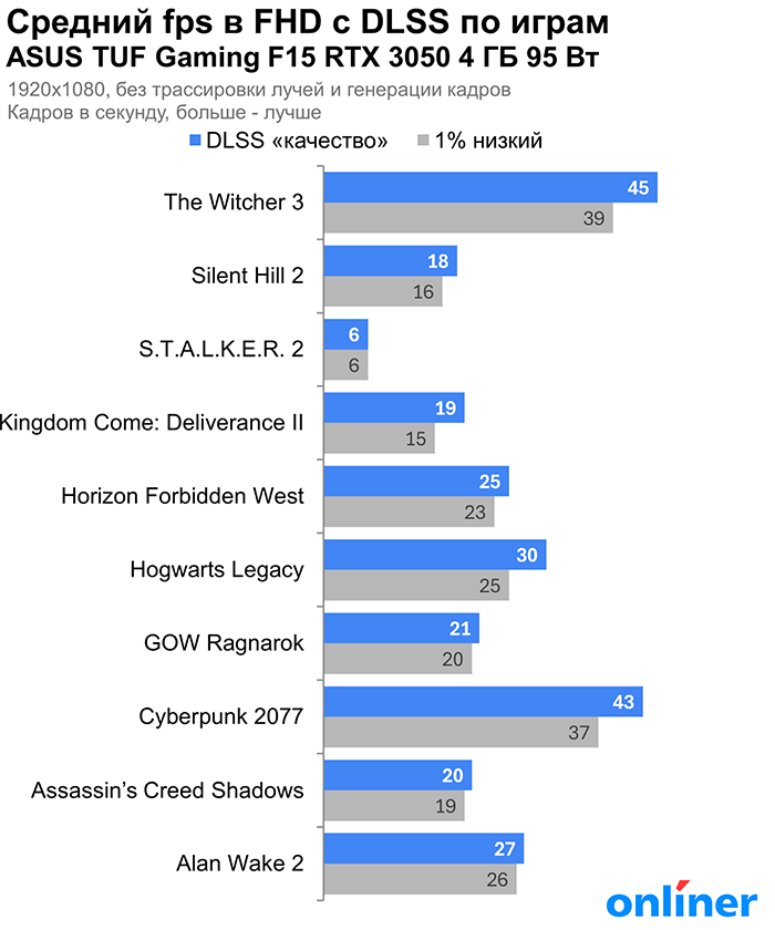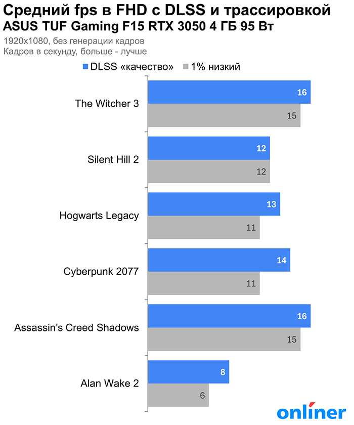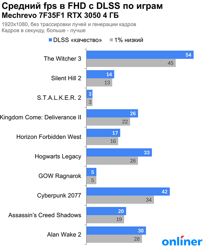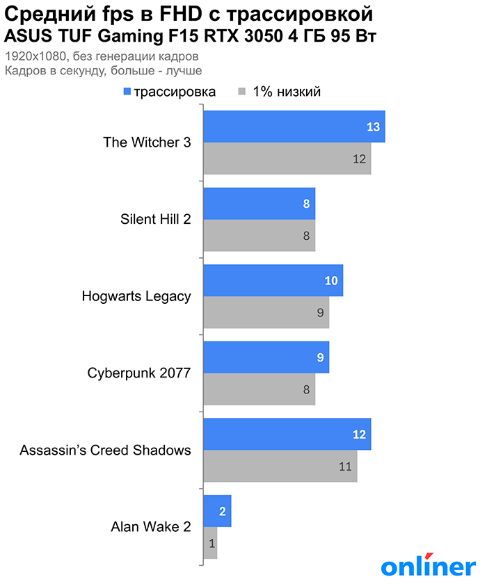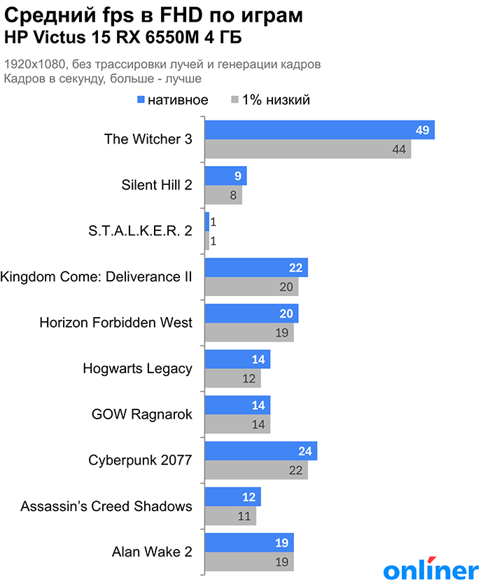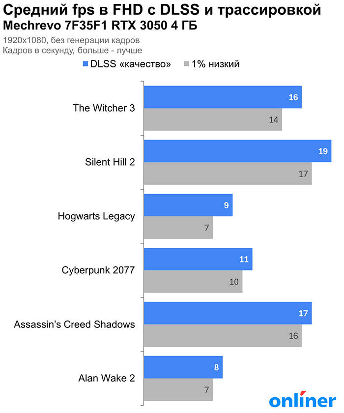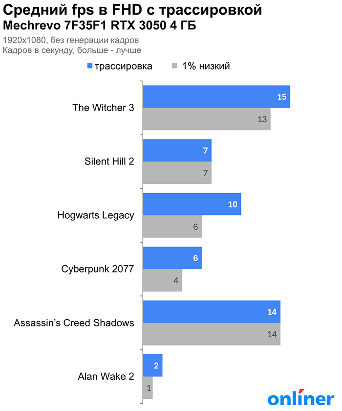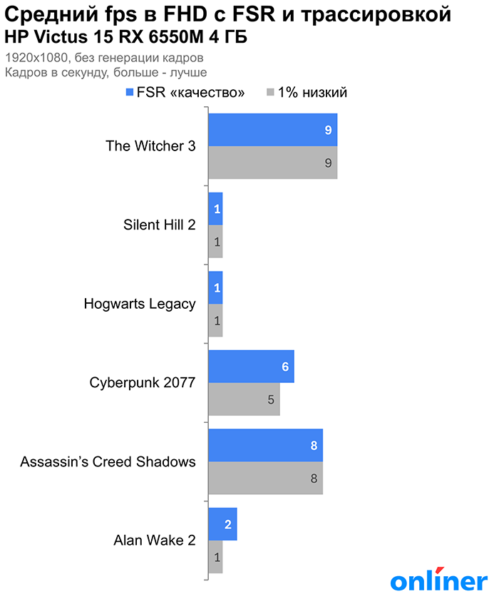 Посередине поделили место Mechrevo и ASUS TUF Gaming c результатами 9 fps среднем. В конце оказался HP Victus — 4 fps в среднем. Его «потянул» вниз Silent Hill 2, который отказался в принципе запускаться после включения трассировки лучей при настройках, которые используются в наших тестах.