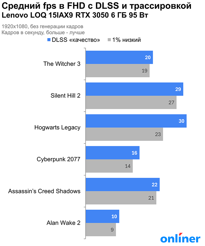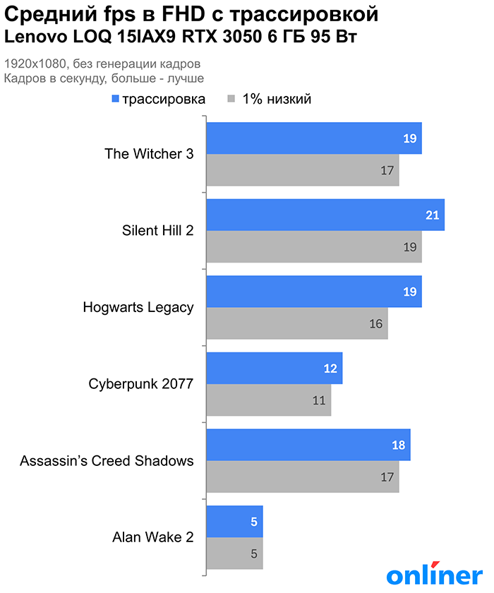 С трассировкой лучей лучший результат показал Lenovo LOQ 15IAX9 — 16 fps.