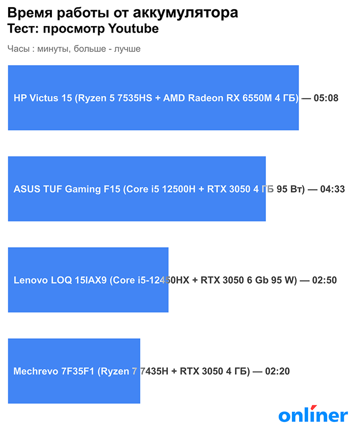 HP Victus в данном тесте показал самое длительное время работы — 5 часов 8 минут. Mechrevo, несмотря на внушительный размер аккумулятора, показал всего 2 часа 20 минут работы от батареи.