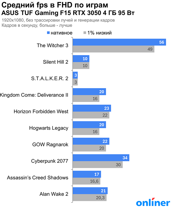 Добавили на графики результаты ноутбуков с RTX 4050 и RTX 4060 из предыдущего обзора — так проще наглядно оценить, насколько они быстрее моделей из текущего теста.