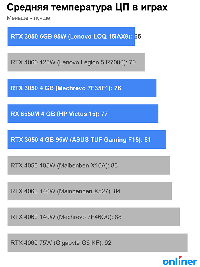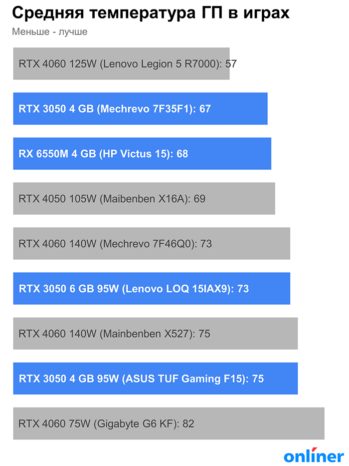 Измерение температуры процессора и видеокарты мы провели при тестировании игр в нативном разрешении без применения DLSS/FSR и трассировки лучей. Профиль питания ноутбуков был выставлен на максимальную производительность. Синим цветом на графиках выделены ноутбуки, протестированные в рамках этого обзора.