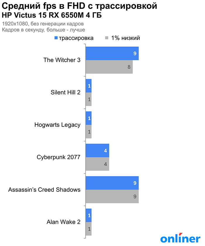 Как и упоминалось ранее, HP Victus с чипом от AMD поддерживает генерацию кадров. В тестах же с трассировкой лучей Silent Hill 2 начал вылетать, измерить средний fps не удвлось. В итоге в этом тесте HP получил символические 1 fps.