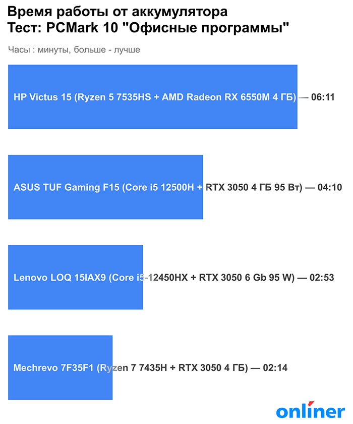В случае с офисными задачами ситуация в рейтинге не изменилась — 6 часов 11 минут у HP Victus и 2 часа 14 минут у Mechrevo. Крепким «середнячком» оказался ASUS TUF Gaming — 4 часа 10 минут работы от аккумулятора.