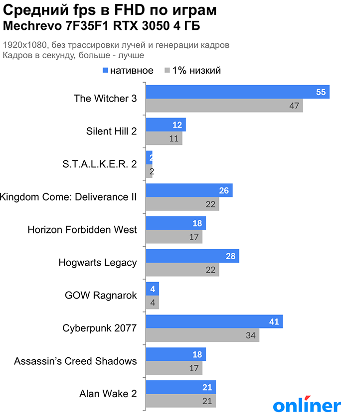 Mechrevo с RTX 3050 4 ГБ — самый доступный участник теста, без изысков в дизайне, но с умеренными 23 fps в среднем за минимальную цену.