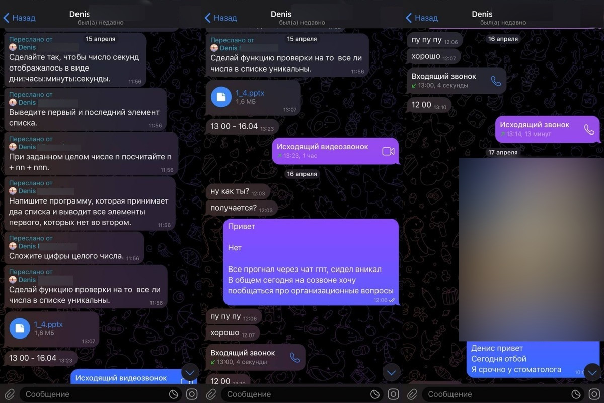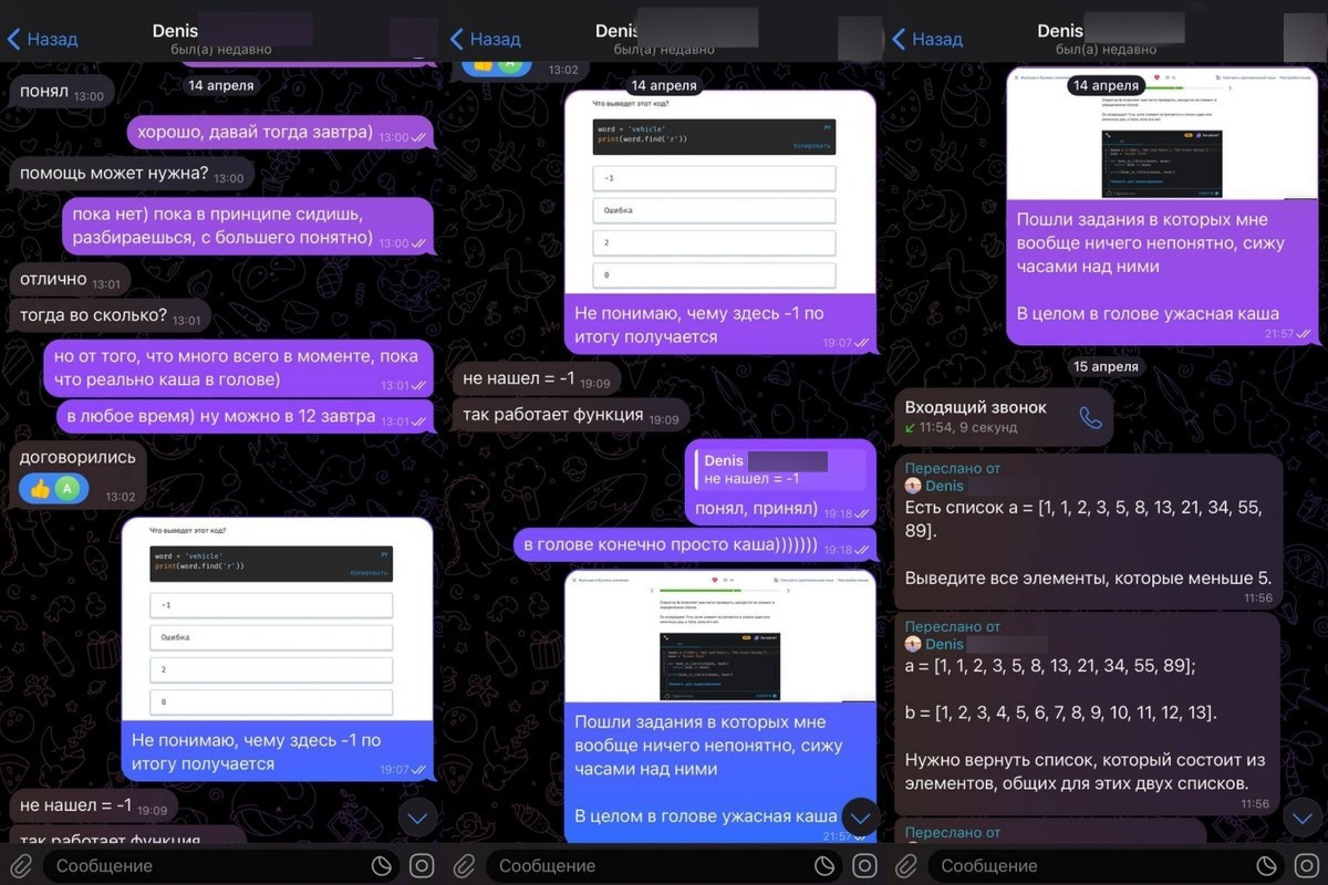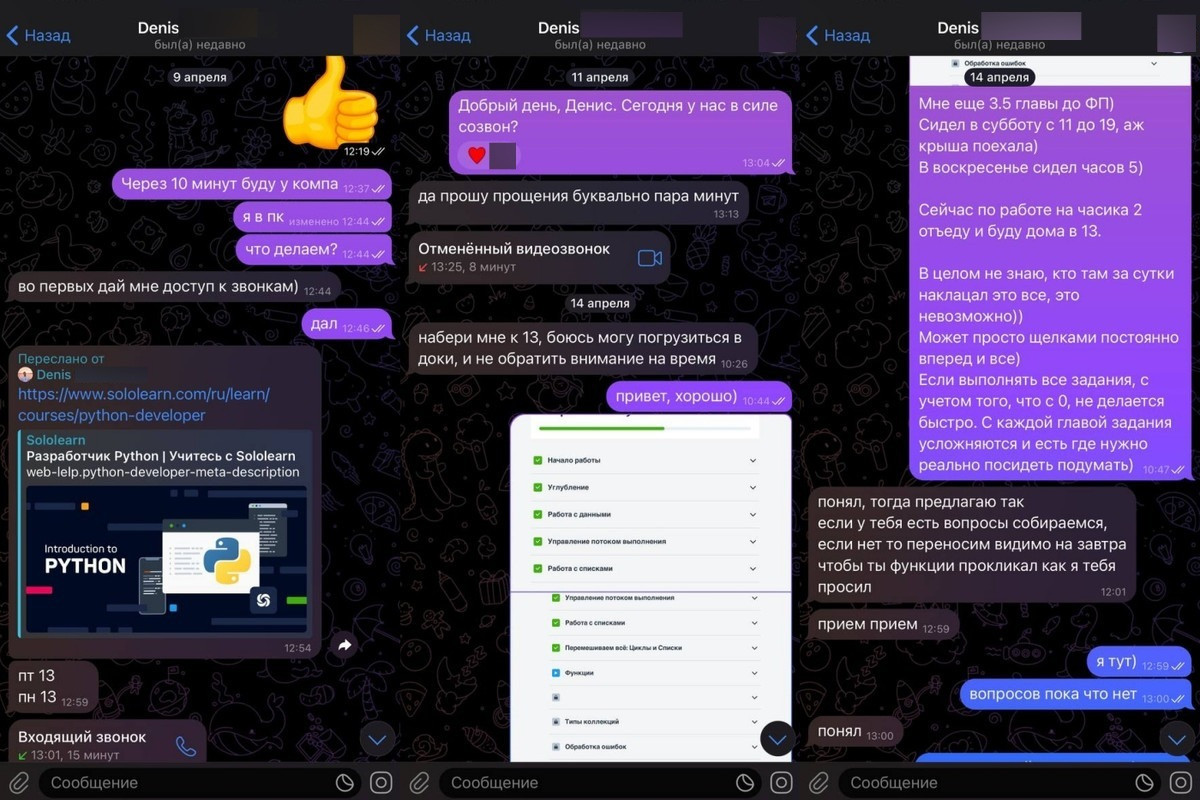Я ответил, что задания очень сложные и занимают много времени, так как начинаю с нуля. Затем я связался с Денисом в Telegram, общался более часа. Я спрашивал: где обучение и почему я его не прохожу [по объяснению Алексея, он имел в виду теоретическую базу]? Денис ответил, что мне необходимо отдохнуть. И сказал: сейчас идет процесс подготовки к обучению.