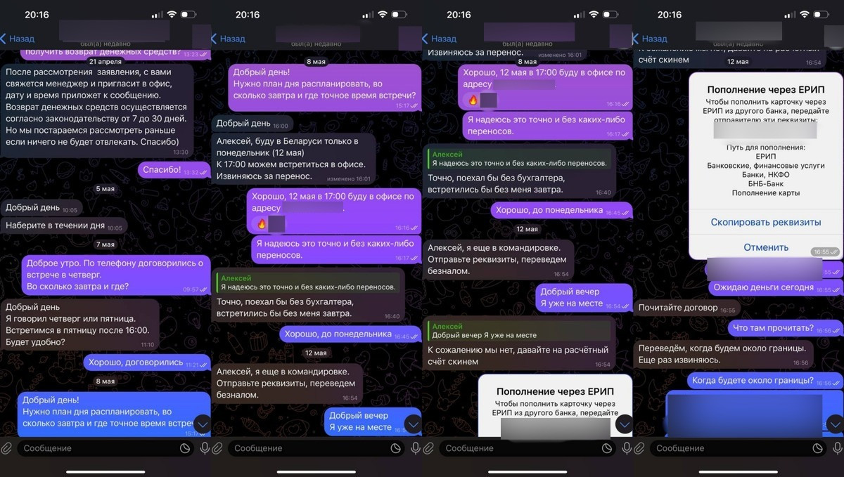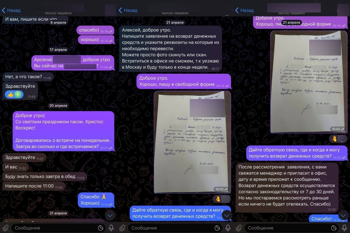По словам читателя, Арсений «неоднократно (четыре раза) переносил встречи, ссылаясь на занятость. Также просил выслать заявление на возврат, написанное в свободной форме, что и было сделано». «Арсений принял заявление, поставив реакцию на сообщение, и подтвердил: возврат средств произойдет в течение 7—30 дней, — говорит собеседник. — В последний раз, заранее оговорив место и время встречи (12 мая, 17:00) для возврата, в 16:50 этого же дня Арсений не явился и сообщил, что находится в командировке».