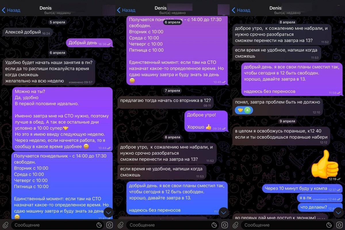 Алексей заявляет, что обучение обмануло его ожидания. И дополняет, что вскоре после подписания договора с ним на связь в мессенджере Telegram вышел пользователь, представившийся программистом Денисом. «С ним мы должны были проходить обучение, однако было несколько переносов, — добавляет читатель.
