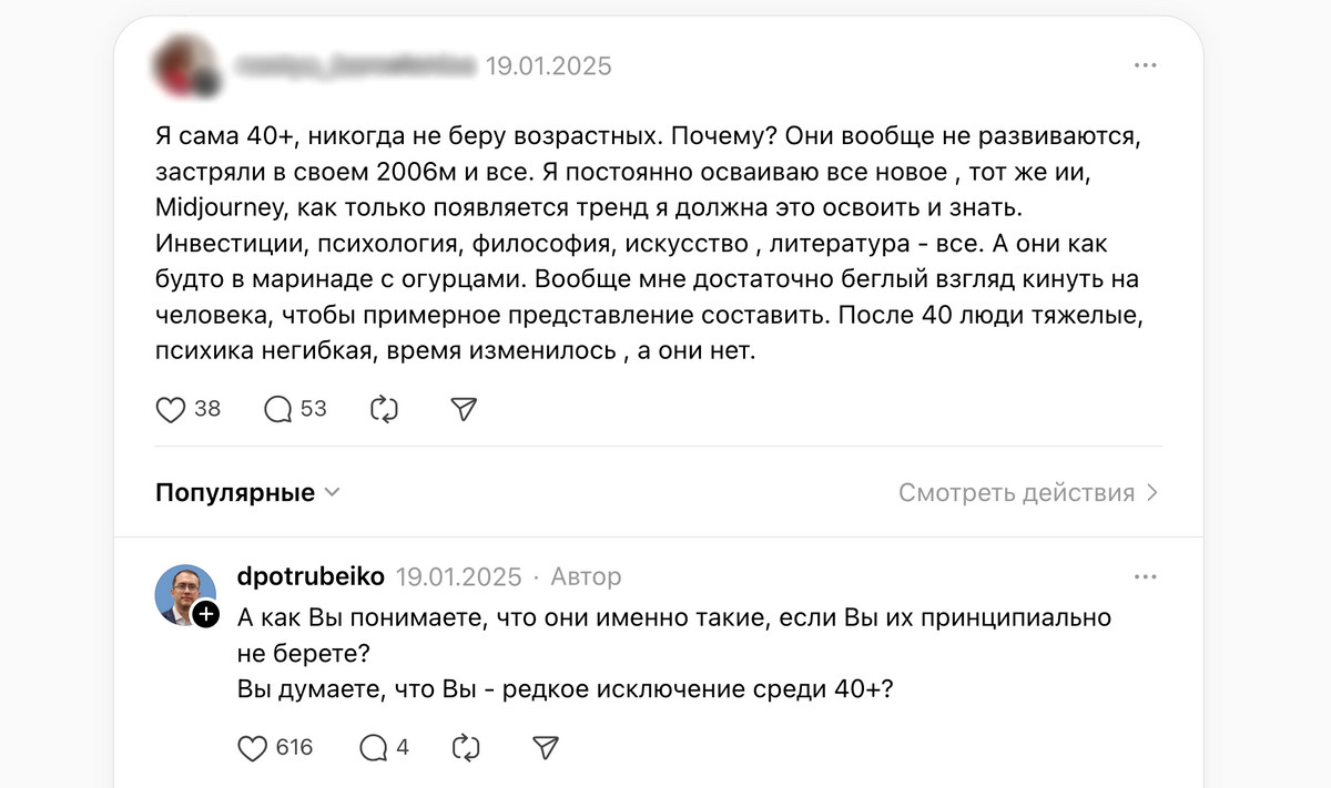 — Дело не столько в компаниях, сколько в нанимающих менеджерах. Нанимают тех, кто не только обладает необходимыми компетенциями, но и с кем будет комфортно работать. Далеко не все хотят и умеют работать с людьми старше себя. Для кого-то это психологически сложно, а кто-то боится конкуренции с их стороны.