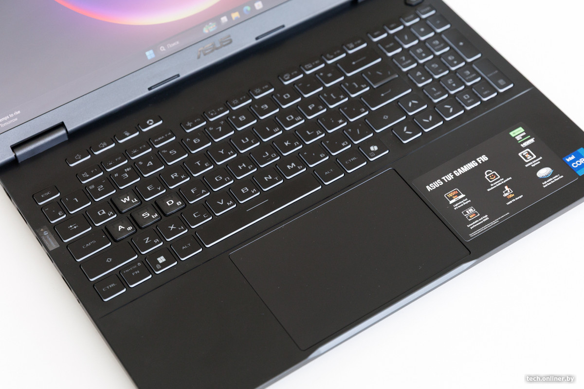 Площадь тачпада в TUF Gaming F16 на 23% больше, чем у Legion R7000 — это не только видно, но и чувствуется при использовании устройства. В отличие от гулкого нажатия в Lenovo, TUF Gaming обладает весьма глухим и еле слышным индикатором клика, но прожимается глубже. В целом впечатления от тачпада здесь приятнее.