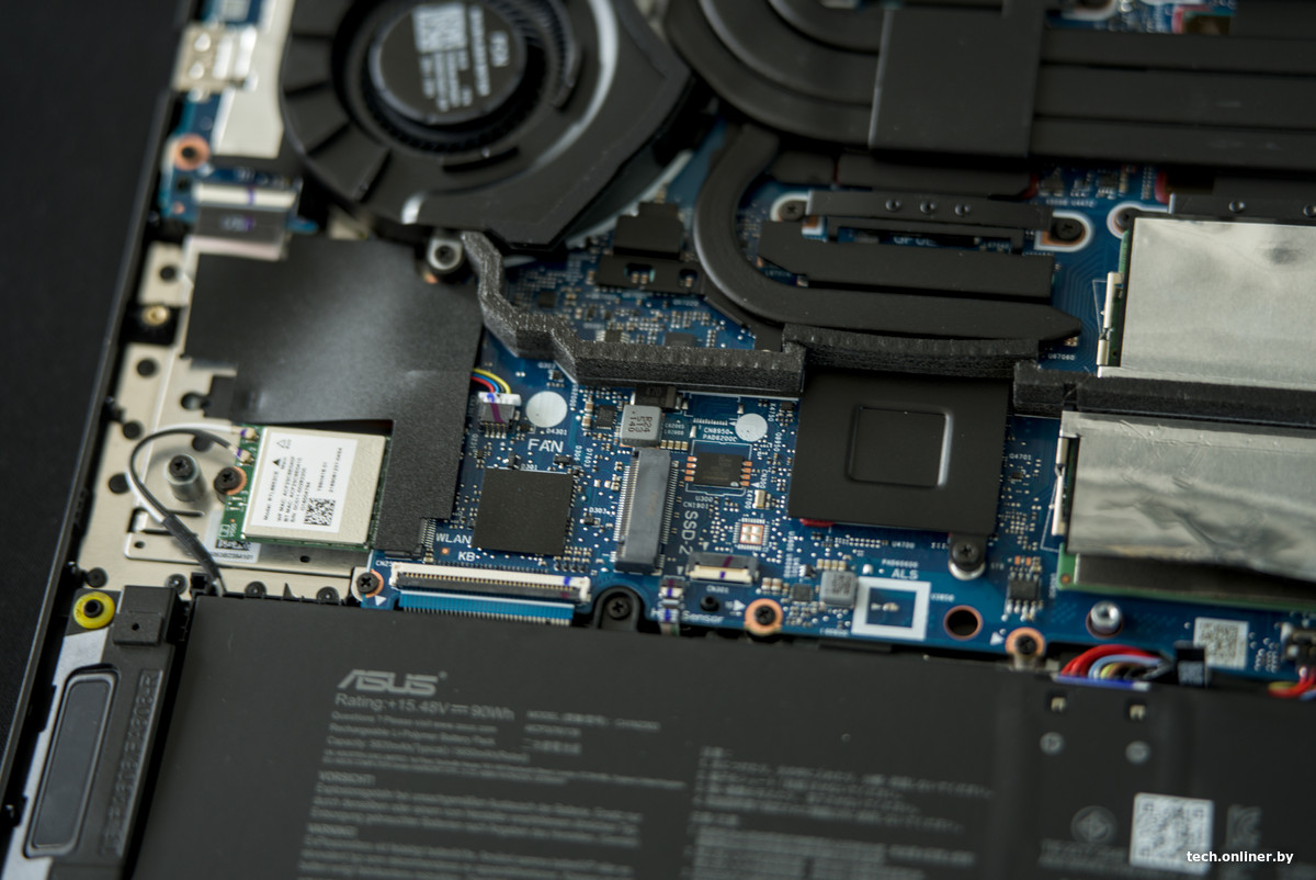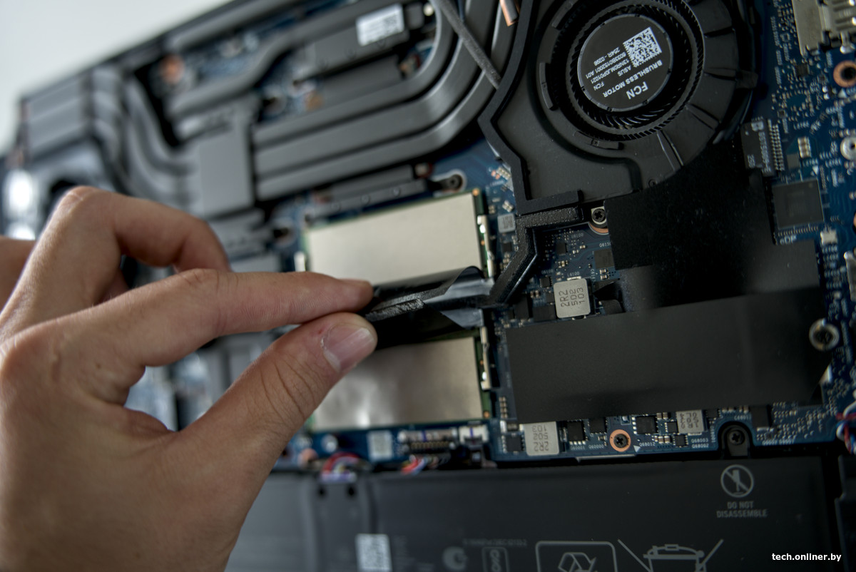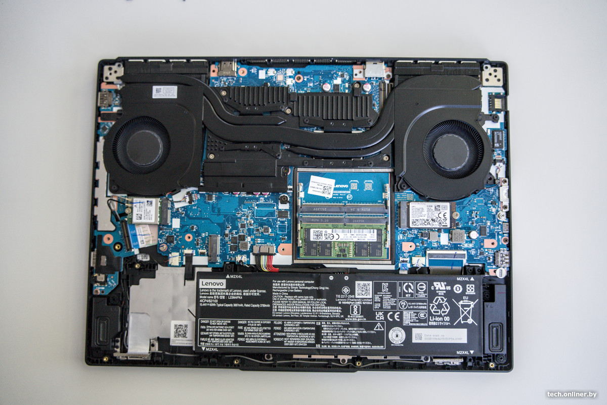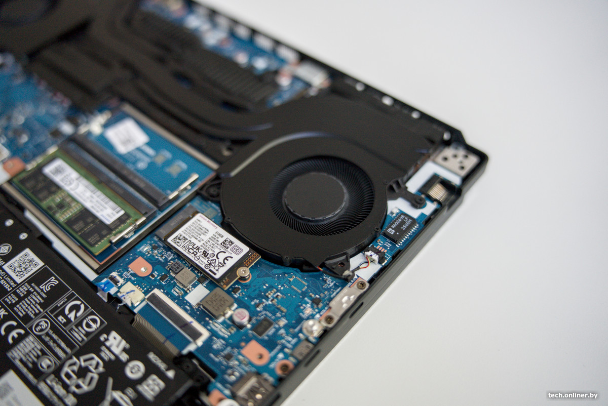 На деле новая решетка оказалась исключительно декоративной. От центрального и графического чипов тепло отводится по одной общей теплотрубке, еще две дополнительные тепловые трубки работают отдельно на каждый чип. Оперативная память и накопитель находятся под металлическим кожухом для недопущения их прогрева теплом от основного охлаждения. ОЗУ установлена одной планкой от Samsung, второй слот свободен. Типоразмер установленного SSD — 2242, есть возможность установки второго накопителя размером до 2280.