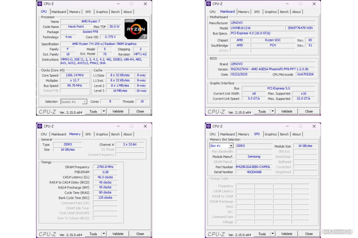 В Lenovo Legion R7000 оперативная память установлена одной планкой Samsung объемом 16 ГБ. Это облегчает процесс апгрейда в будущем, но производительность все равно будет уступать полноценной паре модулей. В TUF Gaming F16 оперативку установили двумя планками Micron по 8 ГБ.