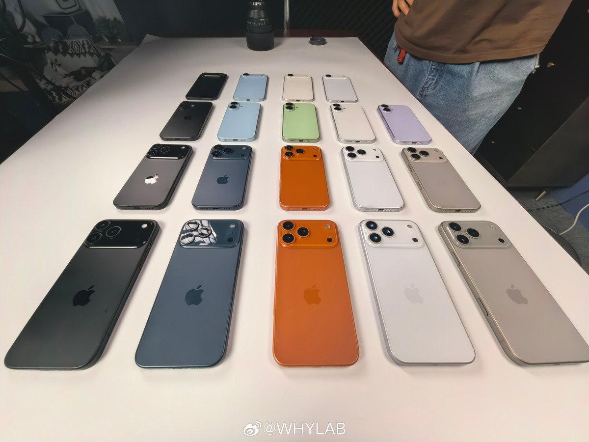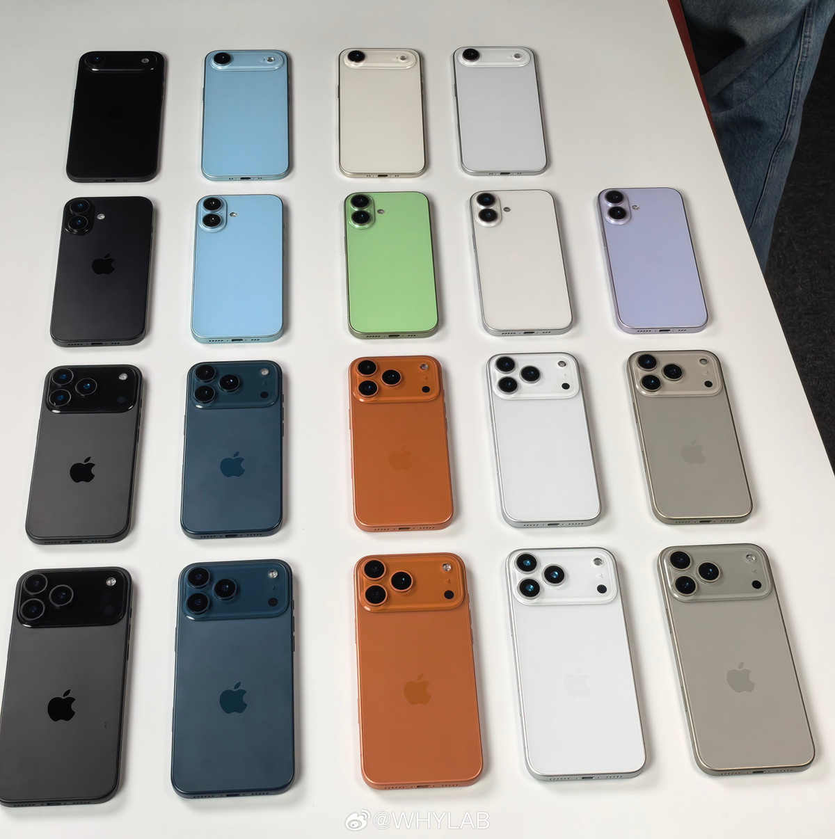 В преддверии презентации Apple, которая состоится сегодня вечером, в китайской соцсети Weibo выложили фотографии, на которых, как предполагается, показаны все 19 вариантов расцветок новых «айфонов» 17-й линейки.
