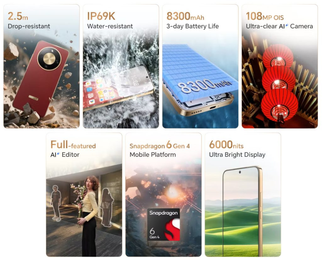 У девайса — экран на 6,79 дюйма с AMOLED-матрицей, частотой до 120 Гц и пиковой яркостью в 6000 нит (по крайней мере, так заявляют в компании). Чипом выступает Snapdragon 6 Gen 4, оперативной памяти — 8/12 ГБ, постоянной — 128/256/512 ГБ. ОС — Android 15 с оболочкой MagicOS 9.0,