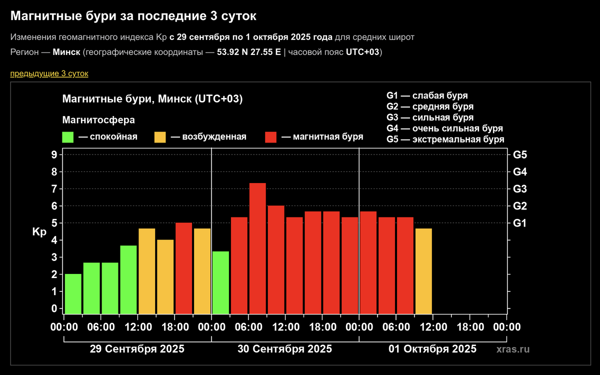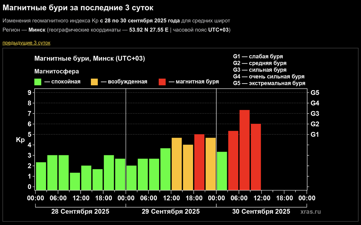 Утром 30 сентября произошло резкое усиление геомагнитных колебаний. Индекс активности Kp вырос до уровня 7.33, что соответствует сильной магнитной буре категории G3+ по 5-балльной шкале, сообщает Лаборатория солнечной астрономии. Это сильнейшая магнитная буря за последние три месяца, которая вновь спровоцировала возникновение полярных сияний, видимых из Беларуси.