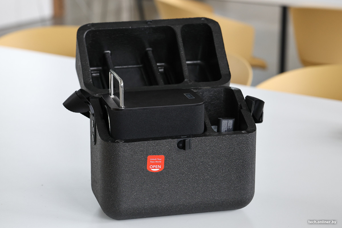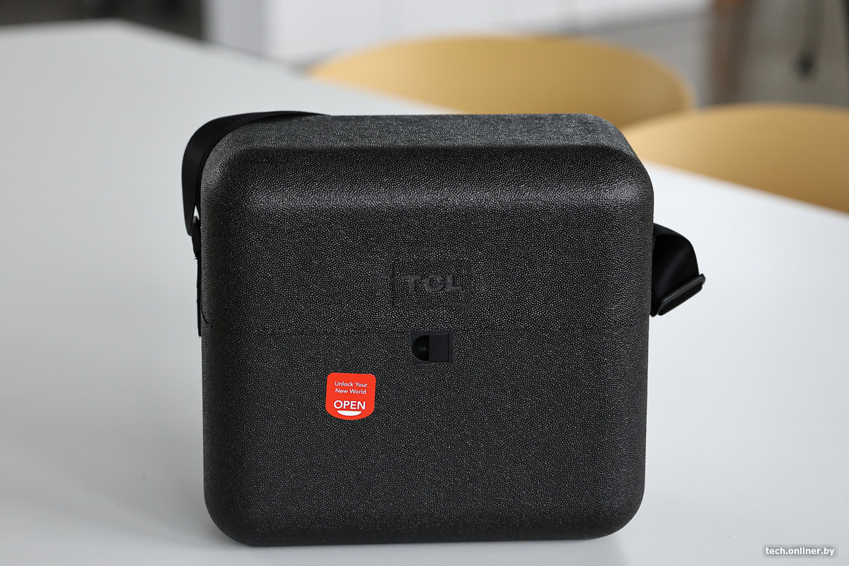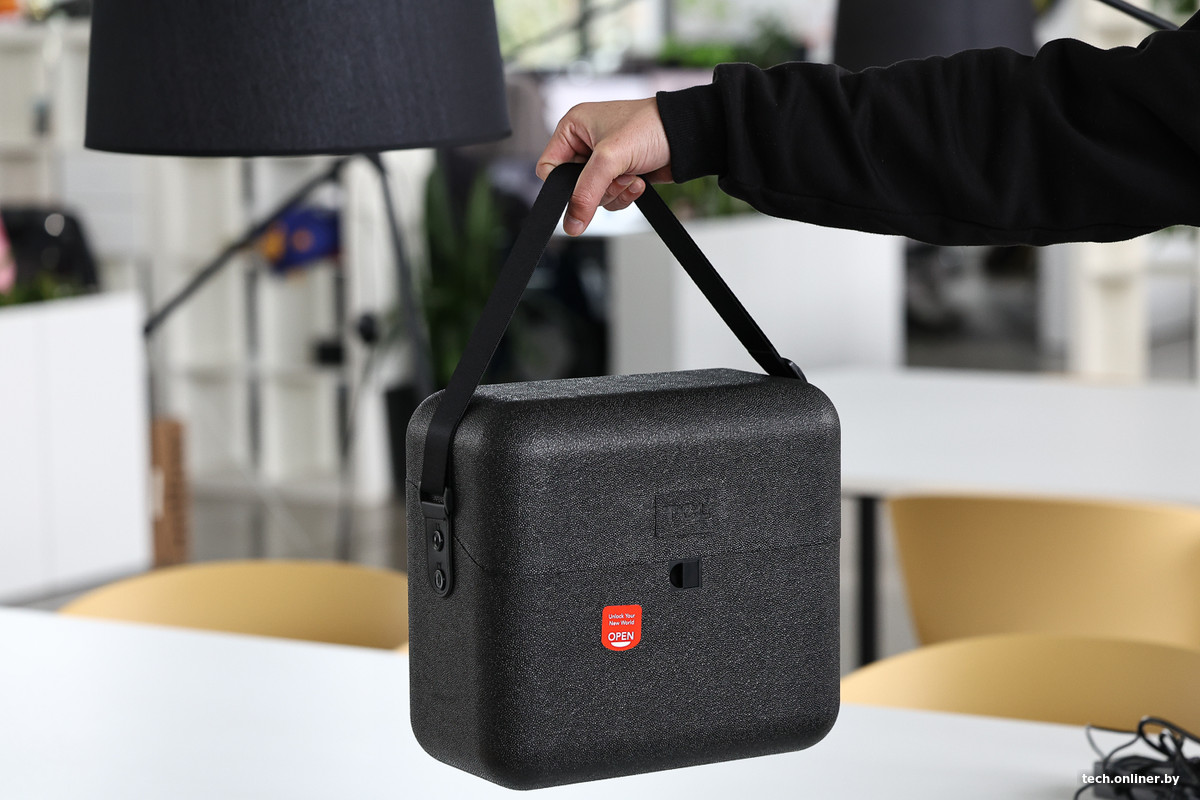 Проектор поставляется в кейсе из плотного материала, напоминающего прессованный пенополистирол и с лямкой через плечо. Выглядит «чемодан» удобно, однако насколько он прочный, судить сложно, потому обходились с ним осторожно (зато он очень легкий и падает, когда пустой). Внутри — сам проектор, кабель питания с выносным блоком и пульт дистанционного управления с комплектными батарейками. Плюс руководство пользователя.