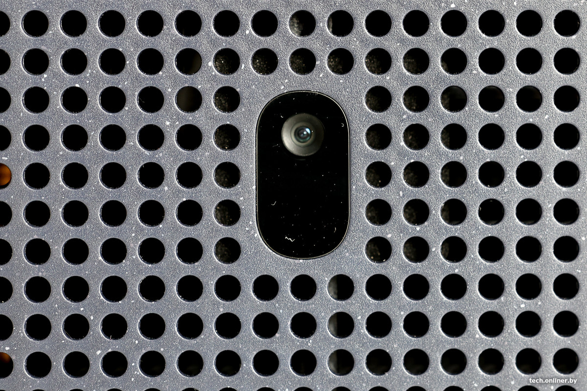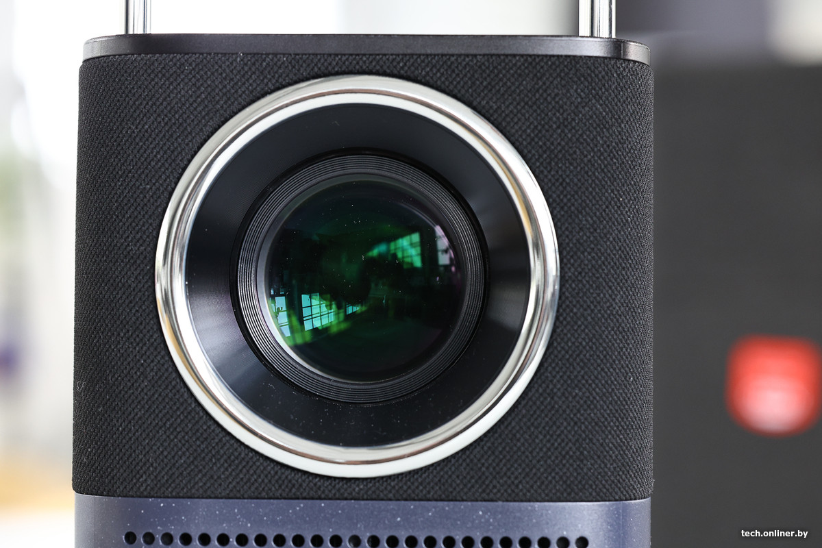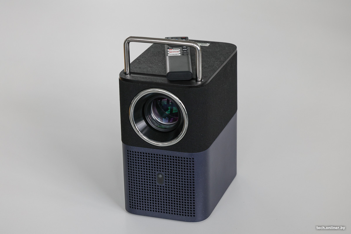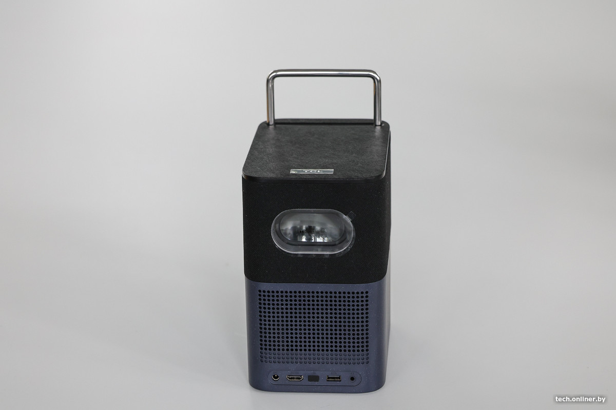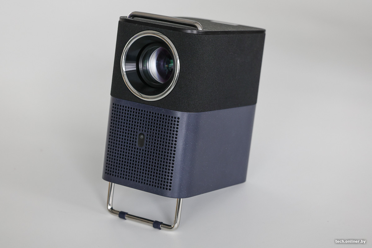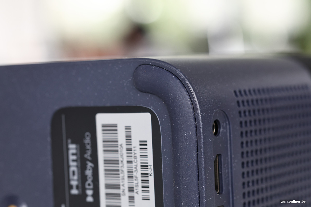 Здесь же — перфорация для системы охлаждения и излучатель «сабвуфера» Dolby Audio в верхней части. Нижняя половина проектора выполнена из голого темно-синего пластика с россыпью белых пятнышек (похоже на звездное небо и маскирует пыль), верхняя закрыта акустической тканью черного цвета. Материал тонкий и мягкий, поэтому, если зацепить пальцами, когда хочется чуть подвинуть устройство, он может некомфортно тянуться.