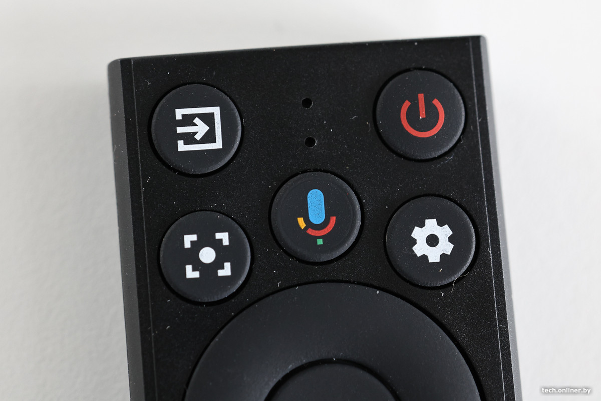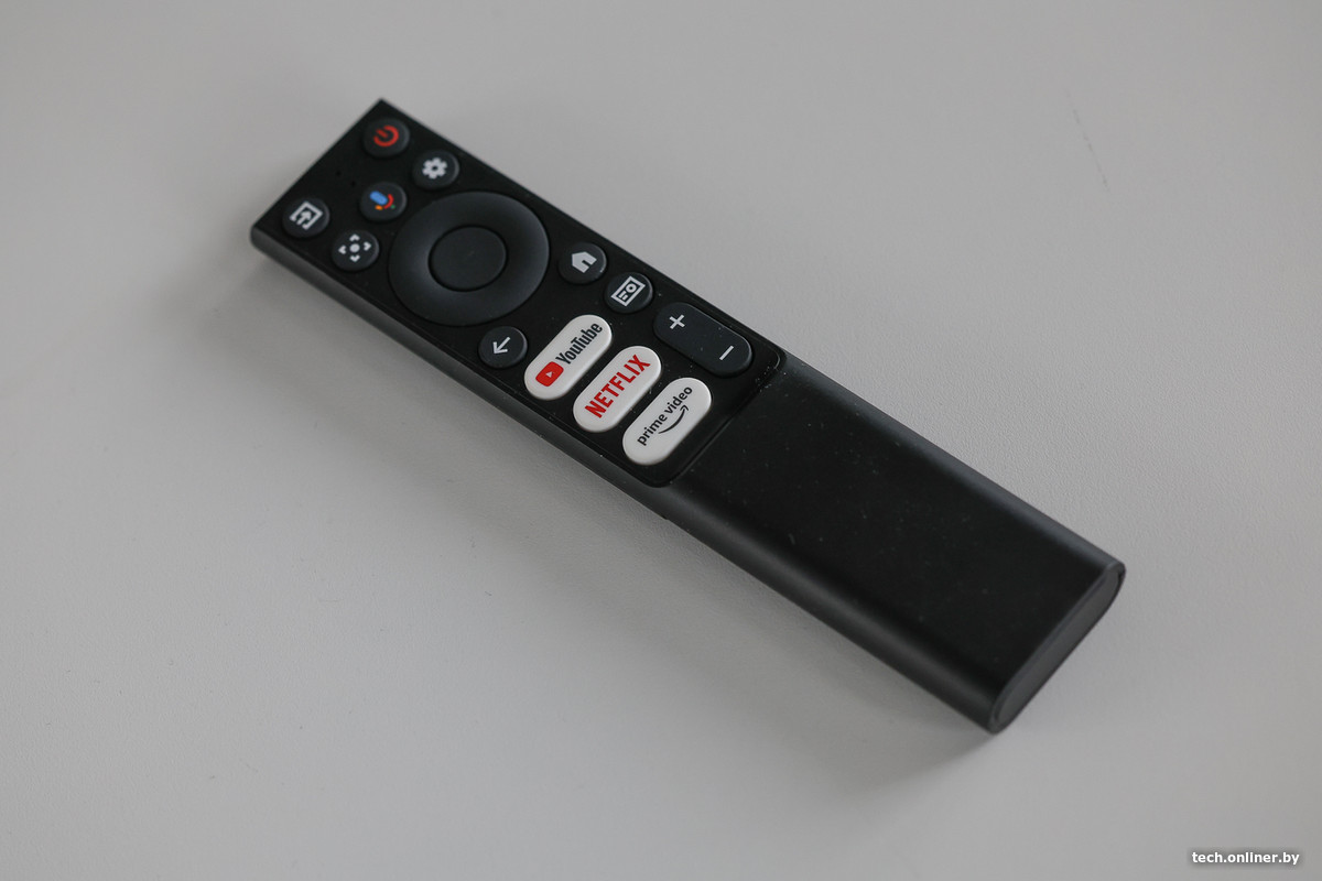 Пульт стандартный, такой можно найти у многих телеприставок, но с небольшими дополнениями. Здесь есть кольцо с шайбой, регулировка громкости, включение, голосовой помощник, «назад» и «домой», а также крупные кнопки Netflix, YouTube и Prime Video. Из дополнительных: клавиша вызова настроек и автоматическая корректировка геометрии плюс пара других. Пульт удобный, знакомый и нареканий не вызывает.