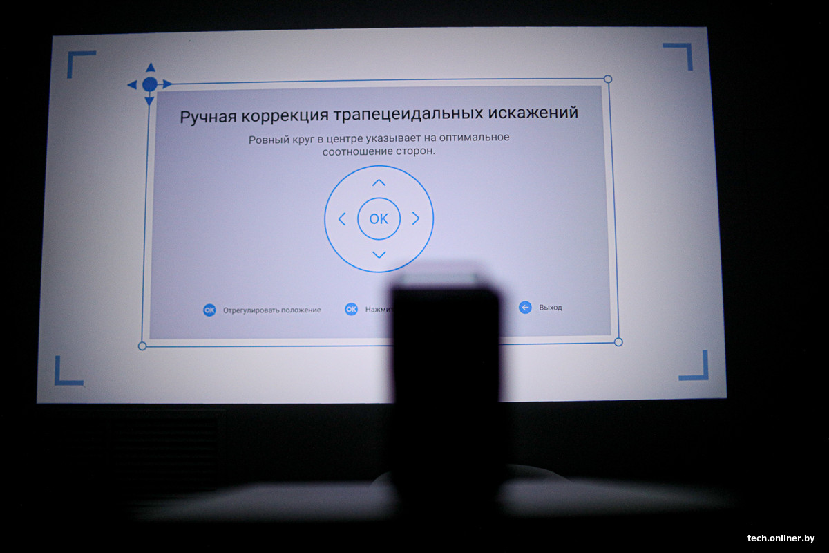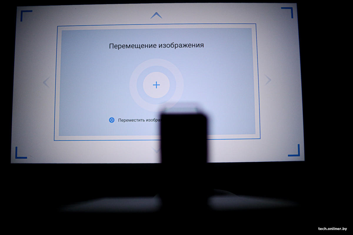 Что уж наверняка понравилось, так это отсутствие необходимости настраивать вручную изображение. Даже если проектор стоит криво относительно экрана (не по центру, под наклоном набок и так далее), встроенные алгоритмы поставят картинку ровно и без искажений. А если проектор сдвинуть на определенное расстояние, он запустит подстройку автоматически заново: главное — не проходить во время этого между экраном и проектором. Если автоматика не справляется, есть ручной режим. Но нам он не пригодился, хотя для корректной работы сенсора нужен приглушенный свет, не засвечивающий экран с выведенной на него сеткой.